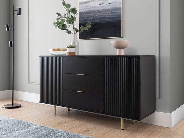 Comoda Newelon K2D3SZ NW02, în nuanțe elegante de negru și auriu, este o soluție practică pentru organizarea spațiilor din hol, living sau dormitor. Cu un design modern și atrăgător, această piesă de mobilier combină funcționalitatea unui dulap cu spații generoase de depozitare.