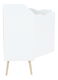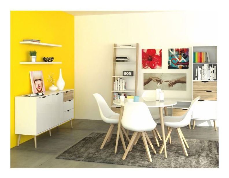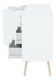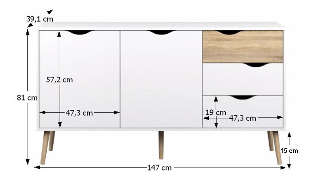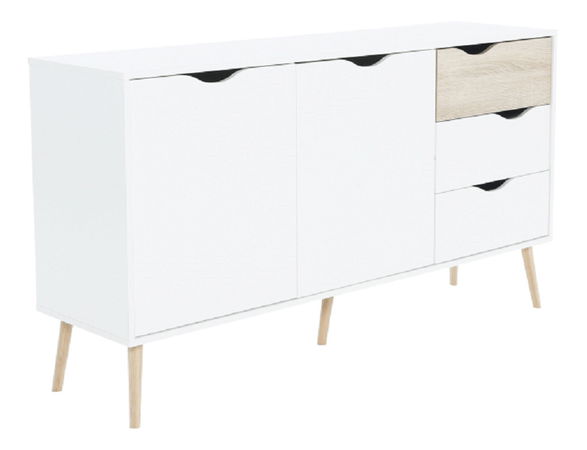 Această comodă vă va atrage nu numai cu un design retro elegant ci și cu un spațiu de stocare mare furnizat de comodă. Are două uși și trei sertare în dreapta. Ușile și sertarele au mânere decupate interesant. Versiunea color a comodei este albă în combinație cu stejarul Sonoma.