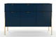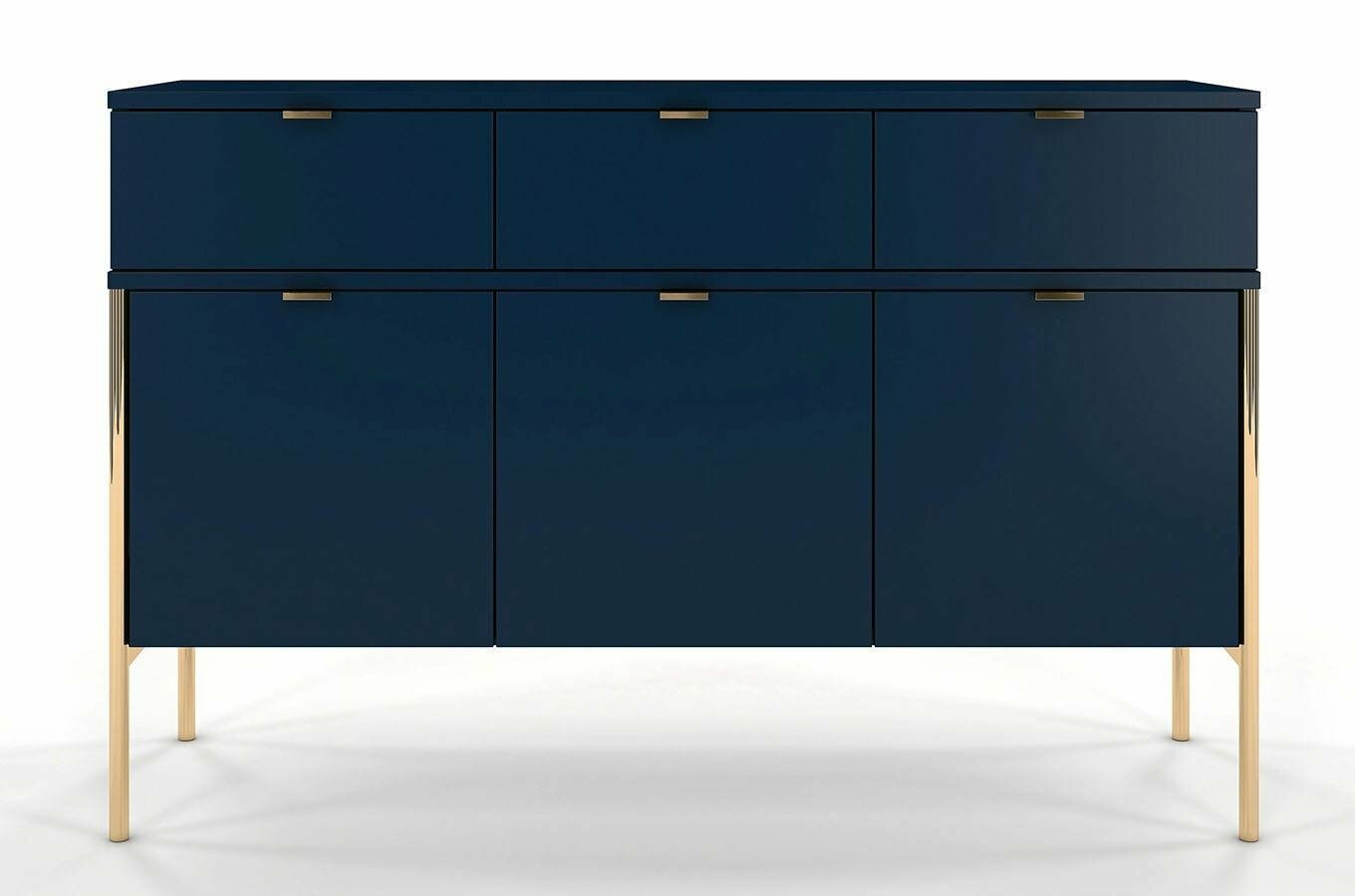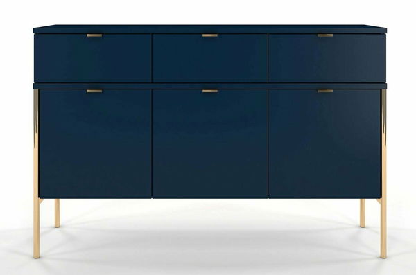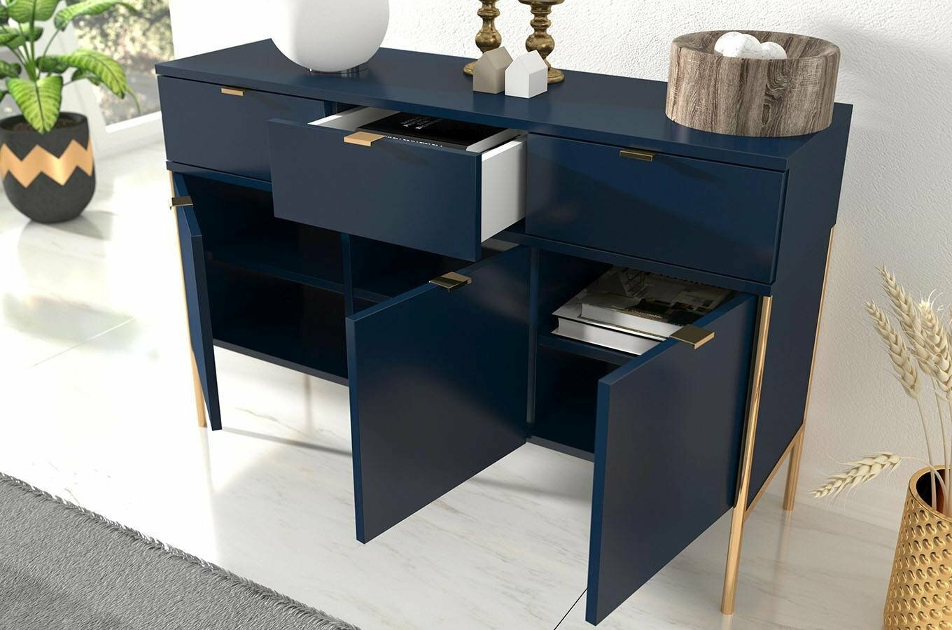 AfișeazăComoda practică, cu suficient spațiu de depozitare datorită a trei sertare și trei dulapuri. Sertarele au funcția de închidere silențioasă. Picioarele înalte, aurii oferă comodei eleganță.