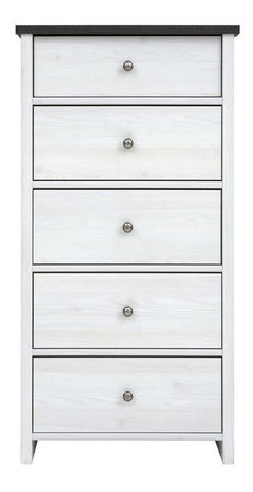 Comodă mai îngustă cu cinci sertare practice pe care le puteți utiliza pentru depozitarea diferitelor obiecte mici, haine sau accesorii. Sertarele comodei au mânere mici rotunjite. Comoda o vor aprecia mai ales cei care sunt iubitori ai mobilierului în stil francez.