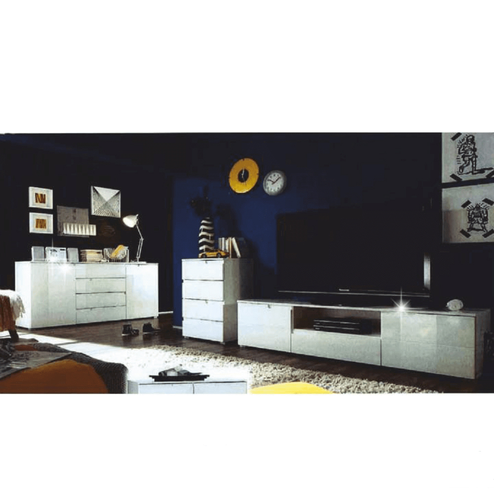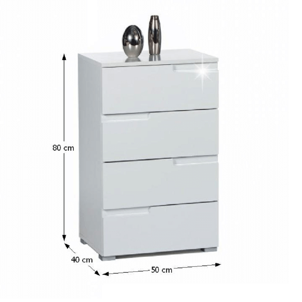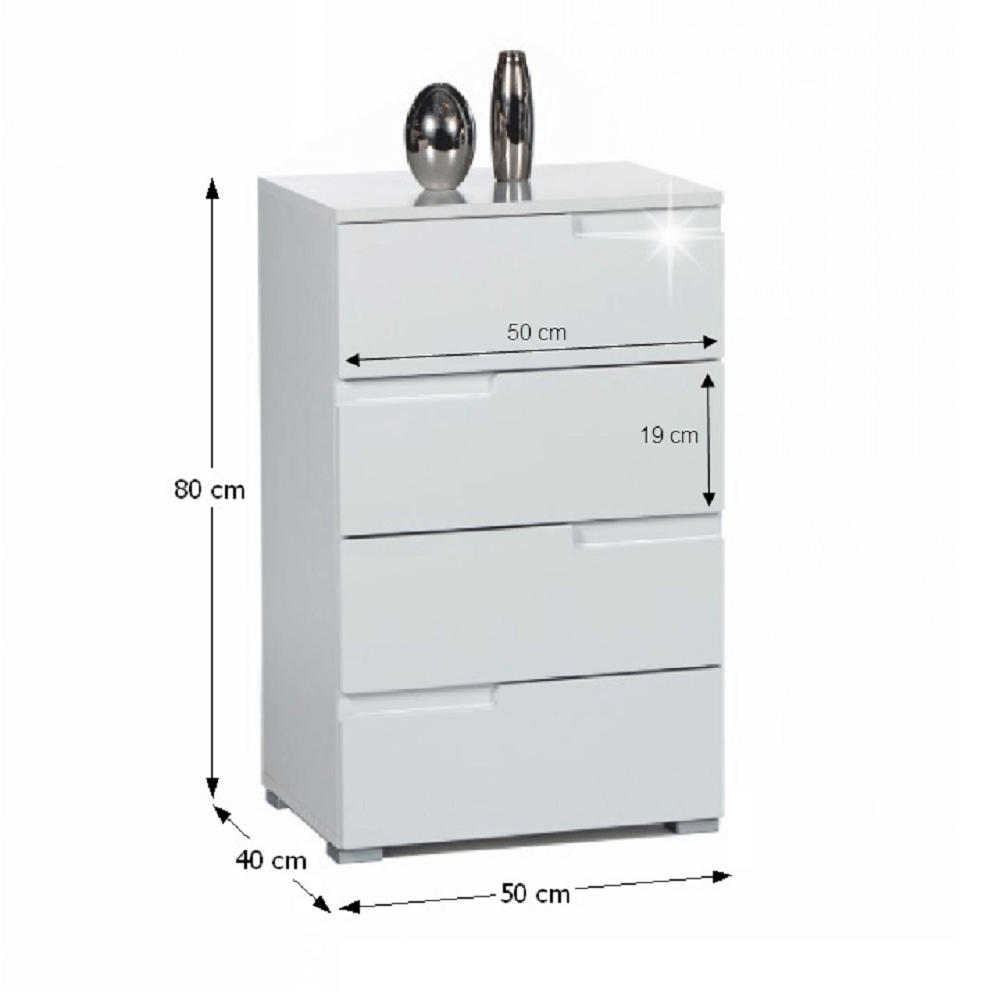 Comodă elegantă care vă va atrage privirea cu un design curat și un stil modern. Va revigora spațiul din camera de zi. Interesant sunt decupate mânerele chiar în colțul sertarelor. Comoda are patru sertare. Versiunea color a comodei este formată din corp alb și un front alb strălucitor.