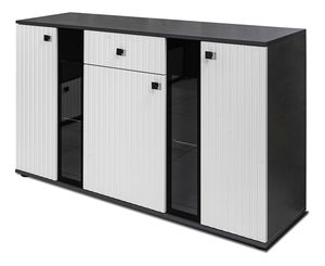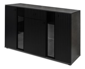AfișeazăVitrina Saul este fabricată din placă laminată de cea mai bună calitate, rezistentă la zgârieturi și umezeală. Lamelele moderne adaugă farmec perfect și eleganță vitrinei Saul. Disponibil pe mai multe versiuni color.