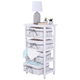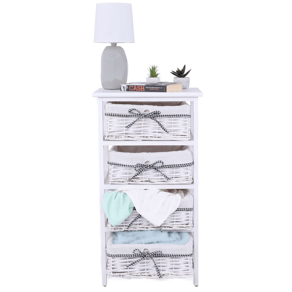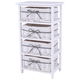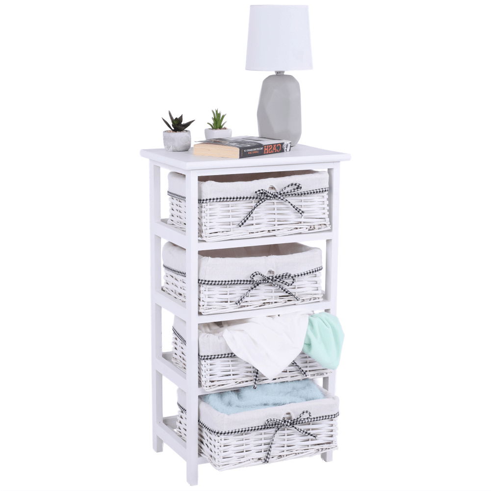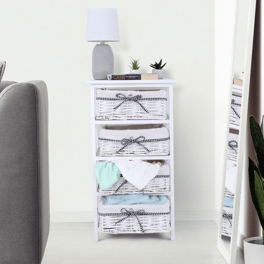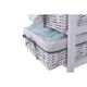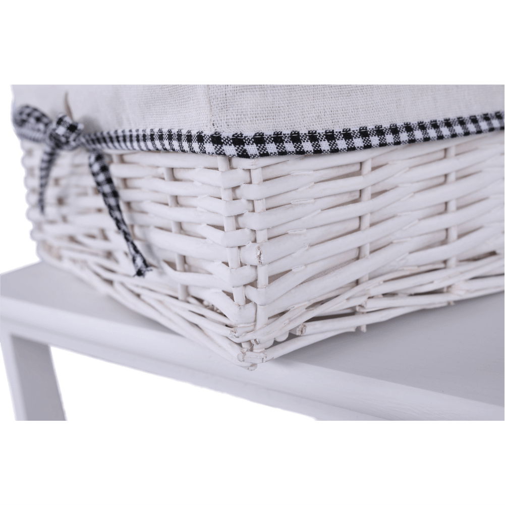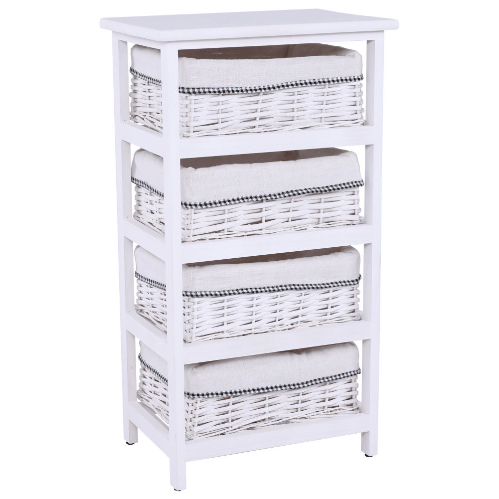 Stilul rustic are din ce în ce mai mulți susținători. Această comodă folosește elemente de stil rustic și nu îndeplinește numai scopul decorativ, dar veți aprecia și utilizarea sa practică, de exemplu în vestibule, dormitoare sau baie. Patru coșuri de răchită sunt decorate cu o panglică. Versiunea color a comodei este de un alb-vechi.