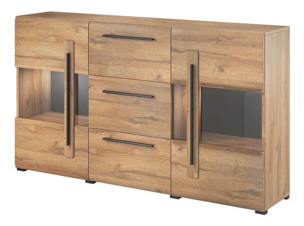 Vitrină cu uși sticlate și rafturi, care oferă atât un design modern precum și spațiu de depozitare pentru accesorile preferate. Pentru un efect unic recomandăm achiziția iluminatului LED. Potrivită atât pentru living precum și pentru birou.