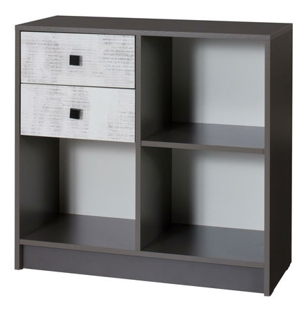 Comodă împărțită cu două panouri pe patru secțiuni. Are trei rafturi deschise și în colțul din stânga sus sunt două sertare mai mici. Comoda are picioare din plastic. Versiunea pe stânga a comodei.