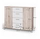 Comodă din trei părți, cu uși pe părțile laterale și cu 4 sertare deasupra sa, cu nuanță albă în mijloc. Material: PAL foliat.