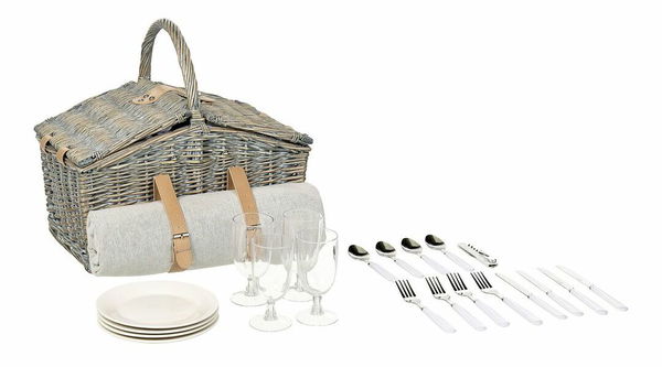 1 x Coș textil, 1 x Pătură, 4 x farfurie mare, 4 x Set tacâmuri, 4 x pahar pentru vin, 1 x tirbușon