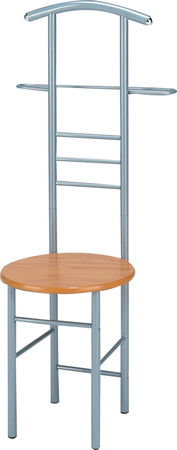 Scaun practic care servește ca și cuier își găsește locul în hol, dar și în cameră sau în dormitor. Construcția din metal în culoarea argintie este completată cu șezut din PAL foliat în culoarea fagului.