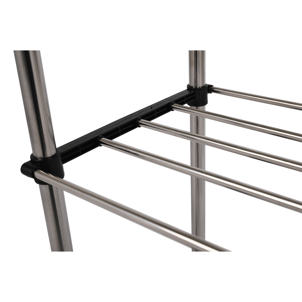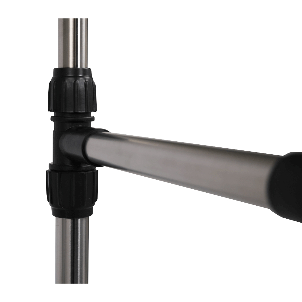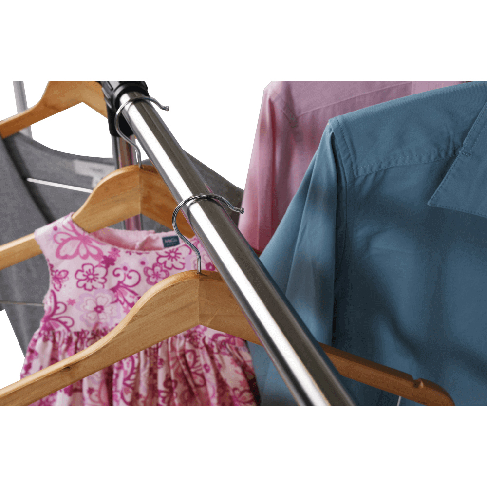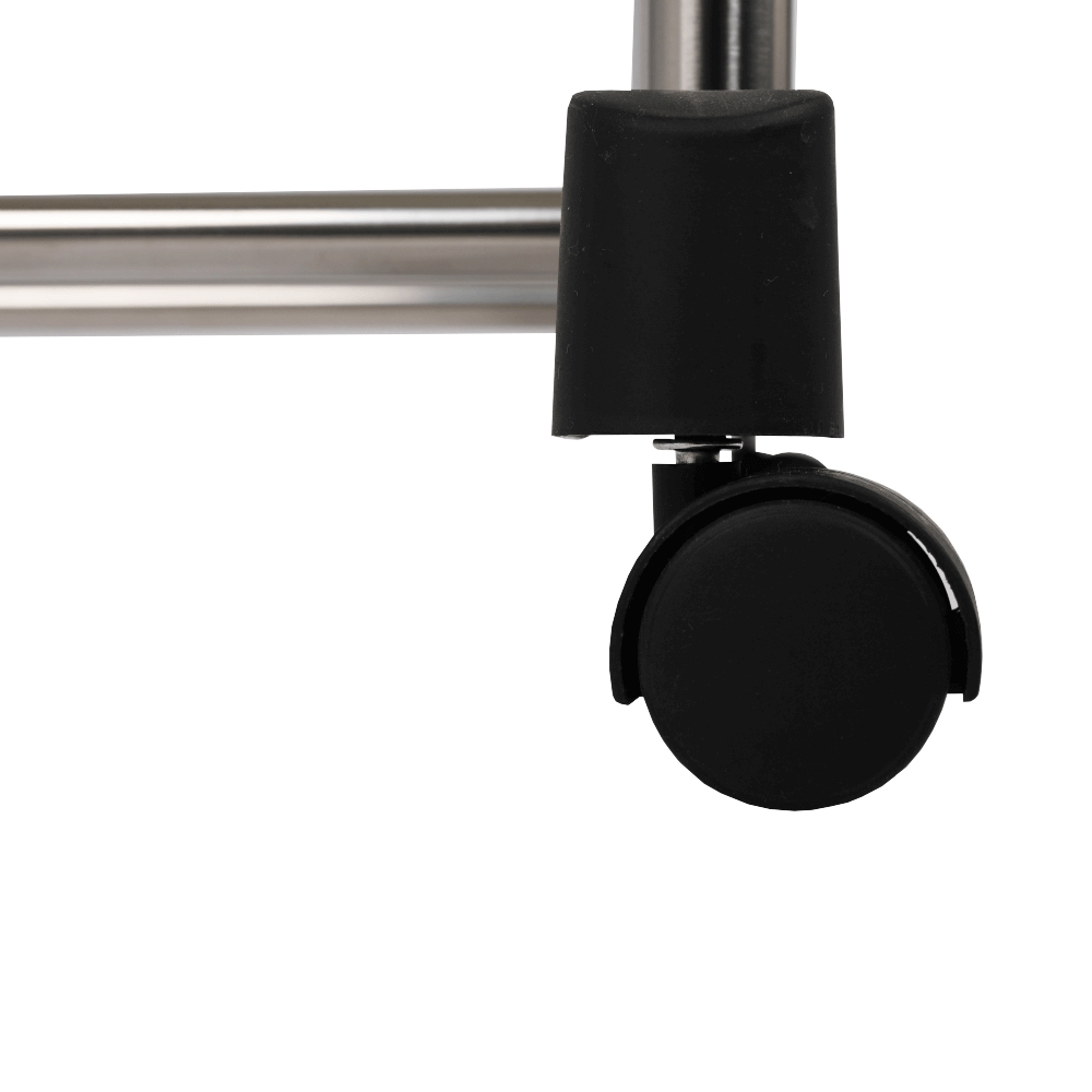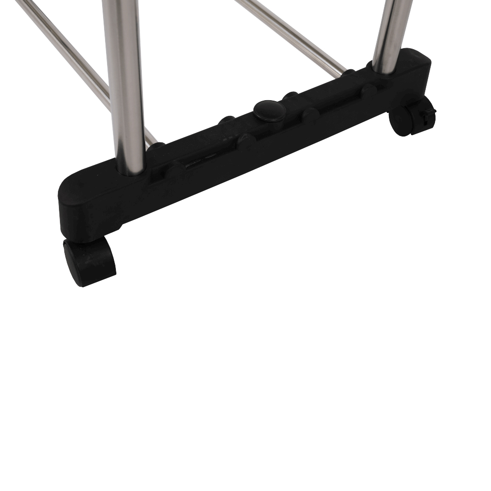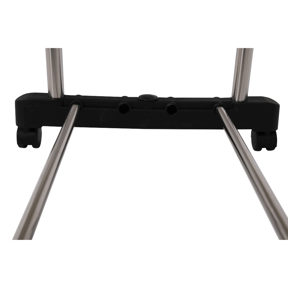 Cuier practic și mobil, cu două brațe, din oțel inoxidabil și o bază din plastic negru, cu lișta de sprijin transversală între brațe asigură stabilitate.