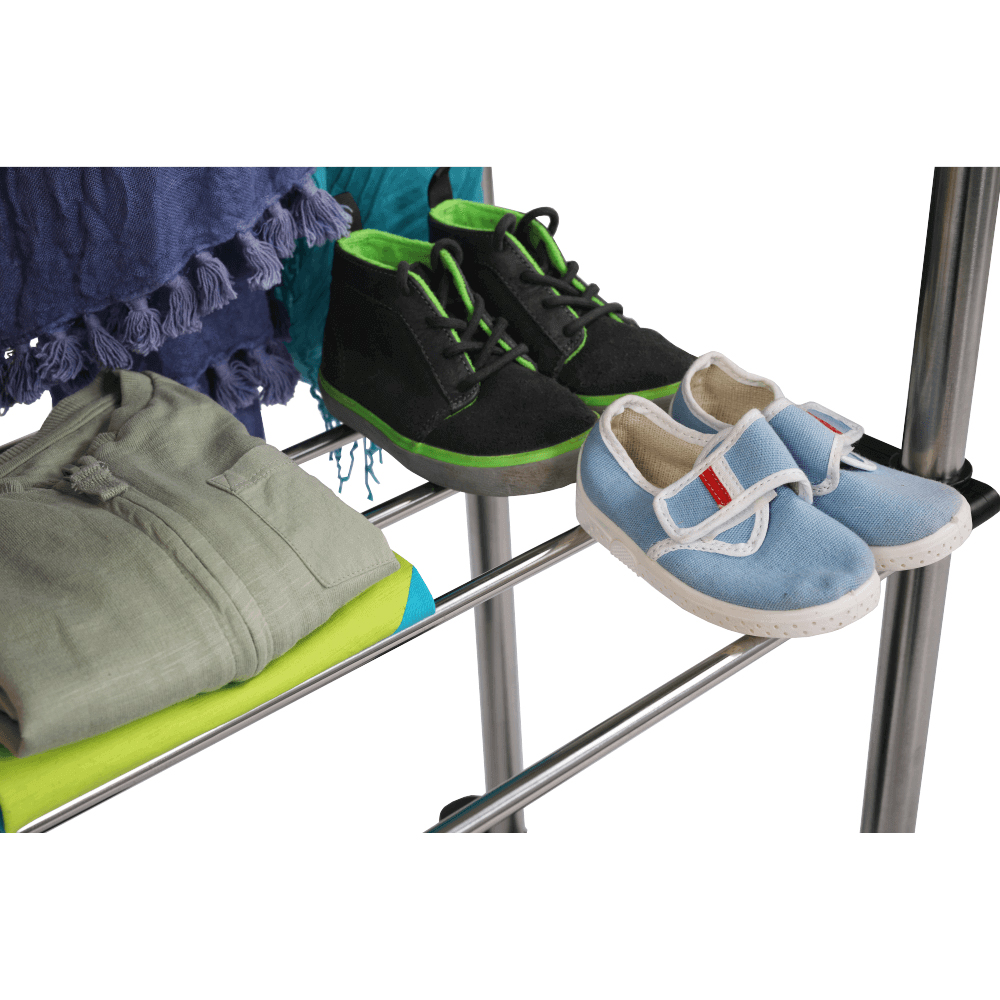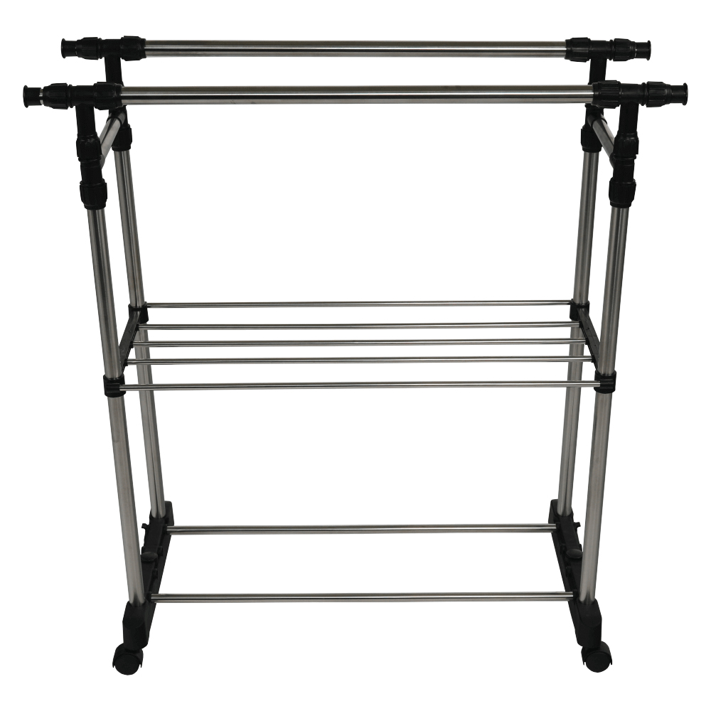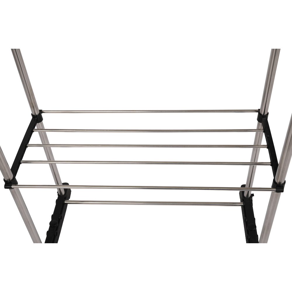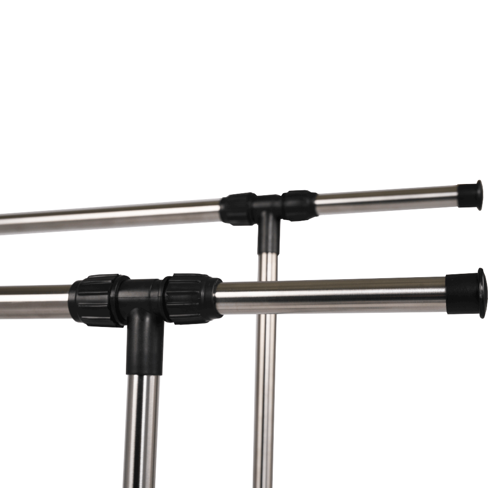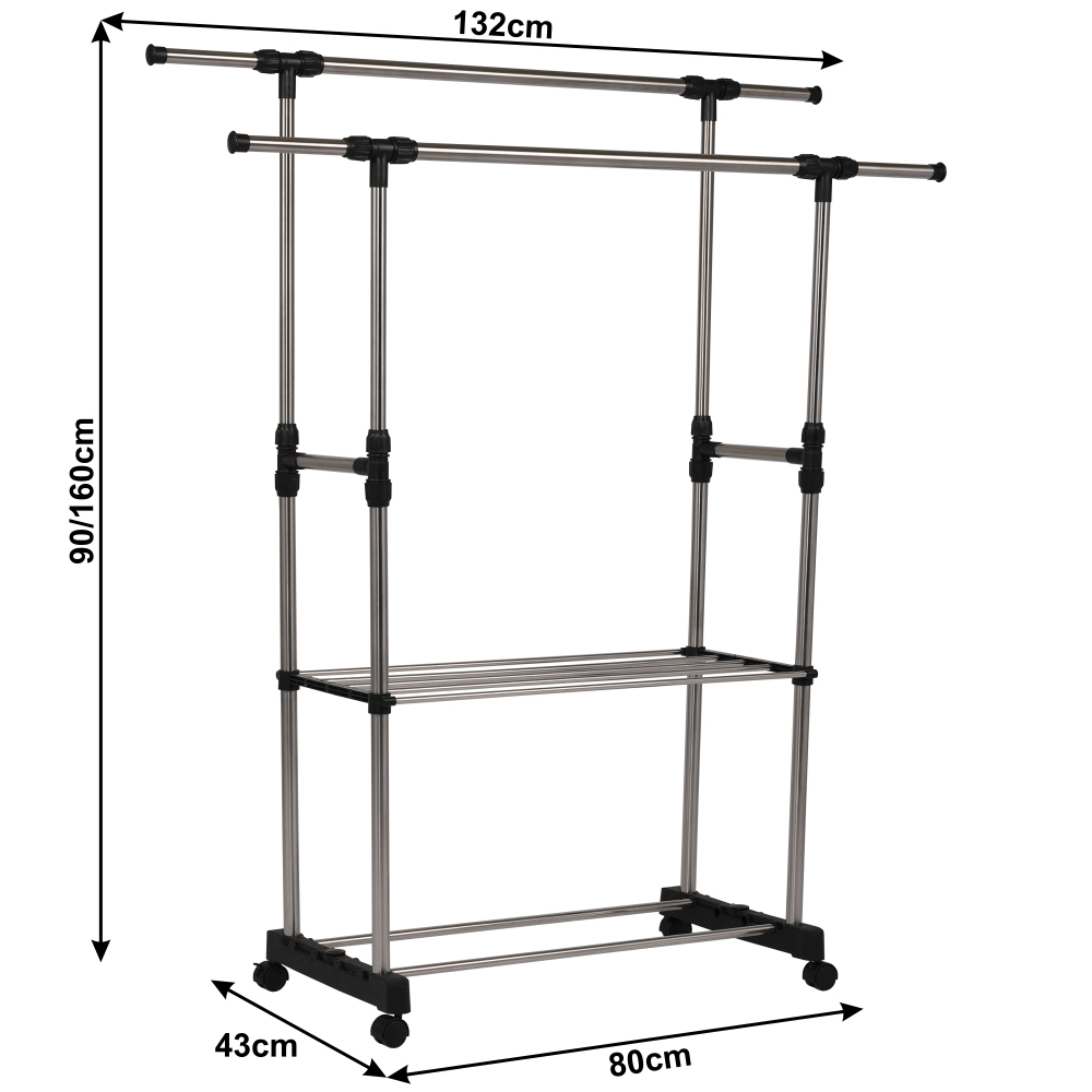 Cuier practic și mobil, cu două brațe, din oțel inoxidabil și o bază din plastic negru, cu lișta de sprijin transversală între brațe asigură stabilitate.