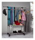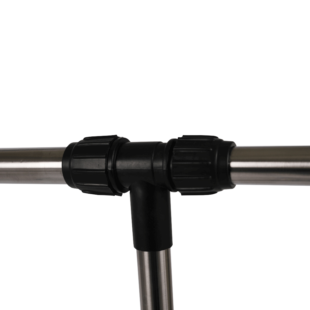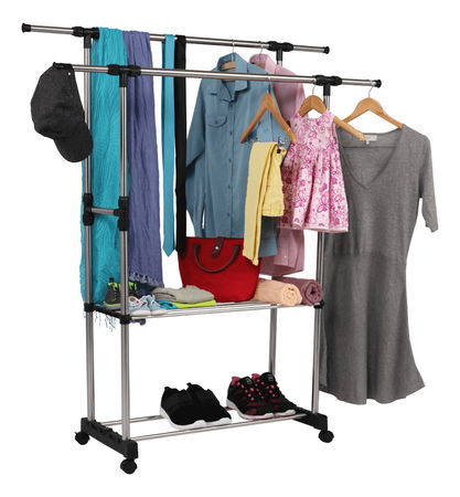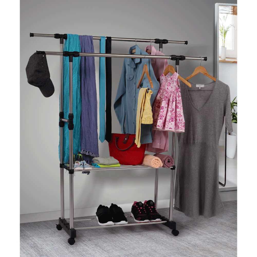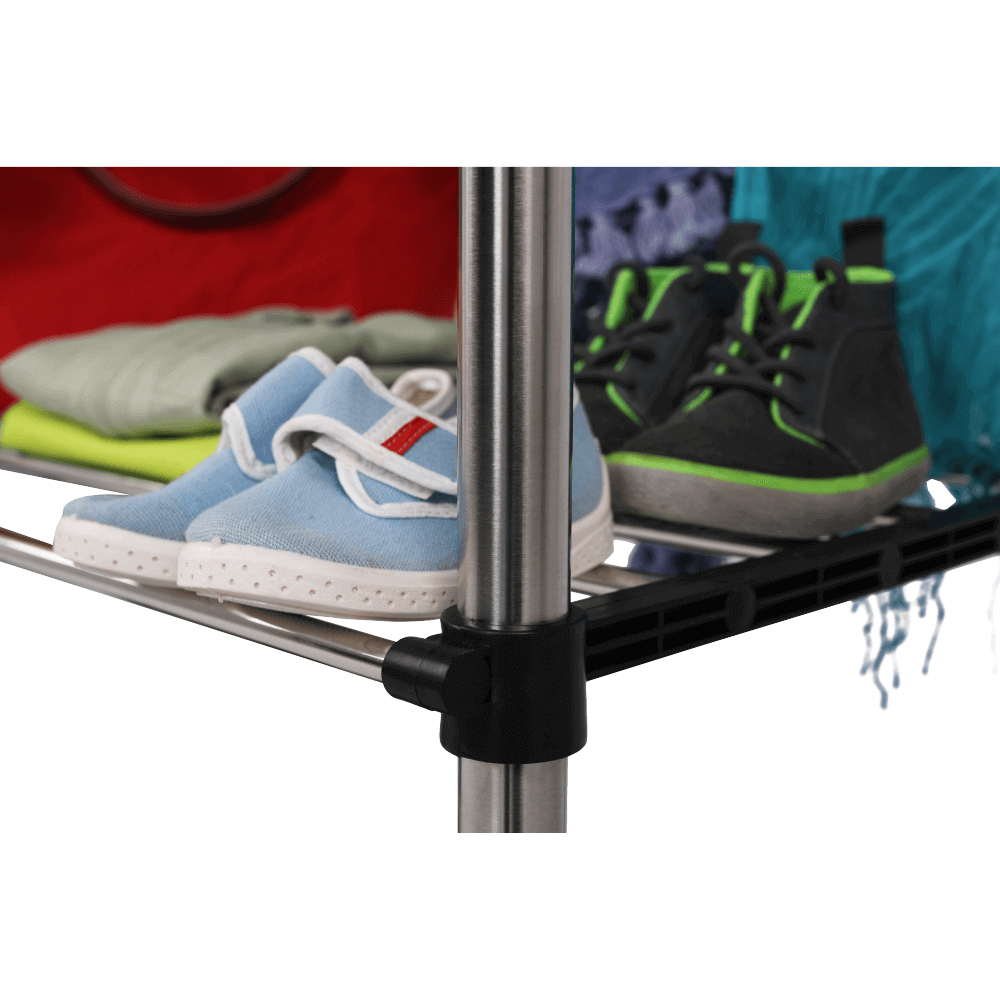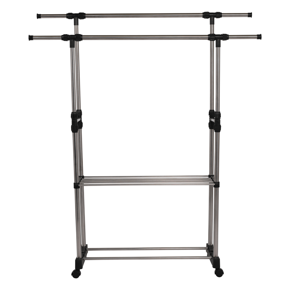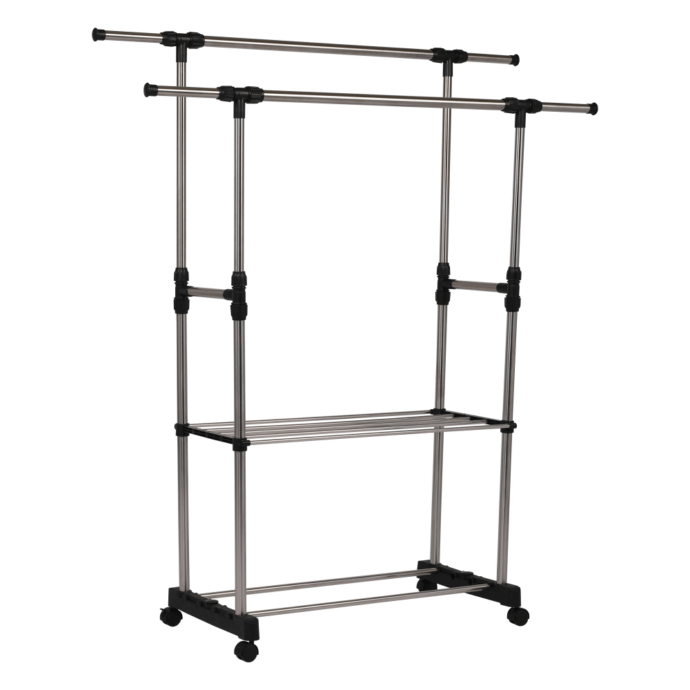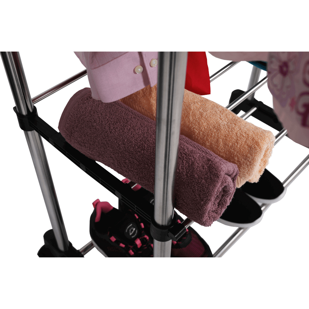 Cuier practic și mobil, cu două brațe, din oțel inoxidabil și o bază din plastic negru, cu lișta de sprijin transversală între brațe asigură stabilitate.