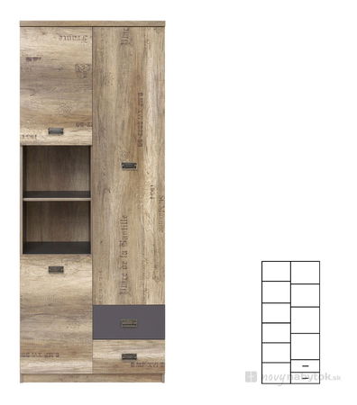 Colecția MALCOLM scoate în evidență designul, care se potrivește perfect cu tendințele noi pentru aranjarea camerei de copii sau studenți. Acest sistem care este format din cinci elemente practice de mobilier se potrivește atât în interioarele mari, înguste, cât și în cele mici. Culoarea lemnului de stejar canyon monument creează un contrast interesant cu culoarea modernă a acestui sezon - griul wolfram. Pe fundalul interesant ies frumos în evidență mânerele metalice și practice de culoarea aurului vechi. Acesta nu este totul, deoarece acest sistem are încă un lucru interesant - o imprimare modernă a literelor pe uși, care câștigă simpatia celor mici și subliniază triumful adolescentului.