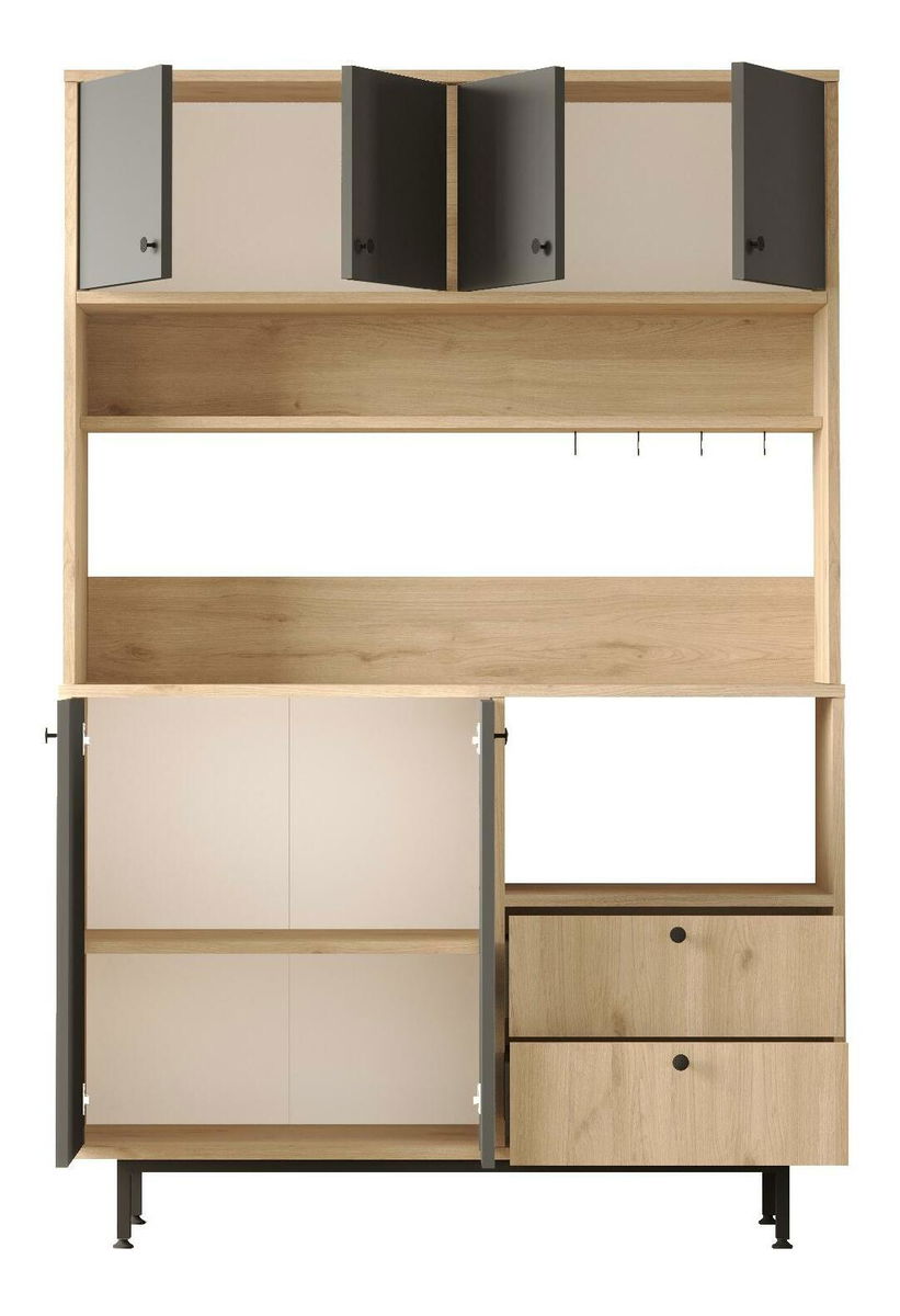 Rebutia 5 este o piesă de mobilier versatilă și funcțională, ideală pentru bucătării moderne sau spații de depozitare. Cu un finisaj cald de stejar și accente în nuanță antracit, adaugă un aer contemporan și rafinat oricărui interior. Compartimentarea inteligentă și multiplele rafturi oferă spațiu generos pentru organizarea vaselor, electrocasnicelor mici, cănișorilor și accesoriilor de bucătărie, facilitând activitățile zilnice.