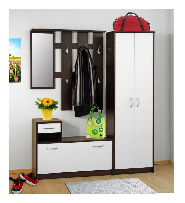 Dulap de haine înalt cu două uși potrivit pentru hol. Materialul folosit este PAL laminat, în versiunea de culoare a stejarului sonoma în combinație cu culoarea albă.