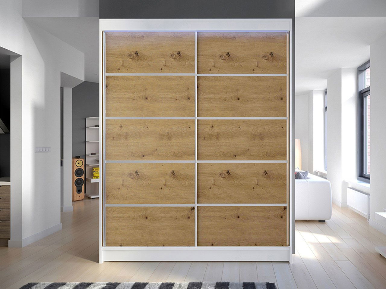 Dulap cu usi glisante Bianca IV (alb + stejar artizanal) (iluminare LED RGB colorat)