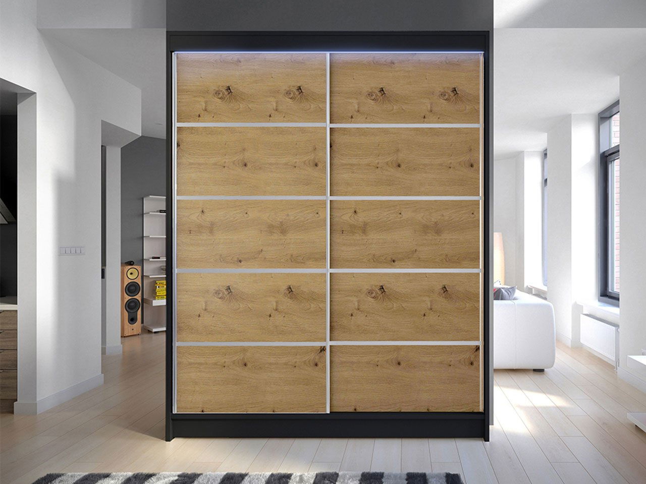 Dulap cu usi glisante Bianca IV (negru + stejar artizanal) (iluminare LED RGB colorat)