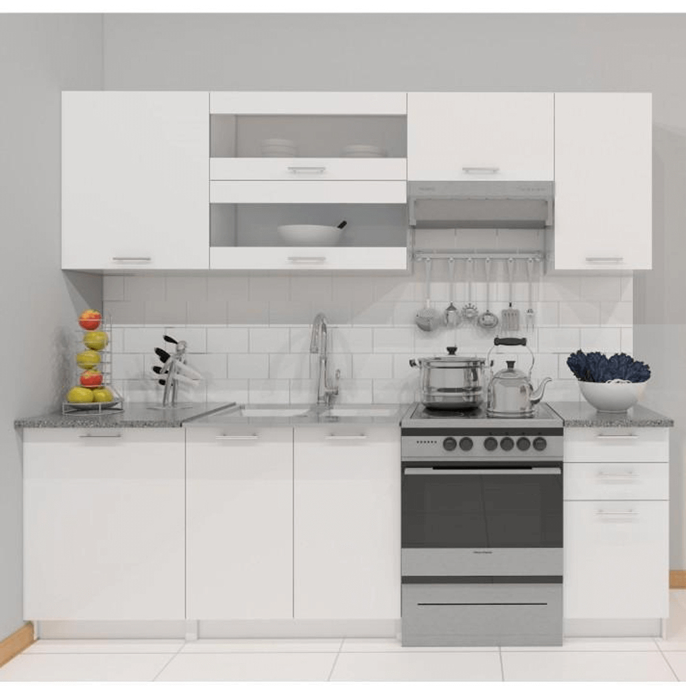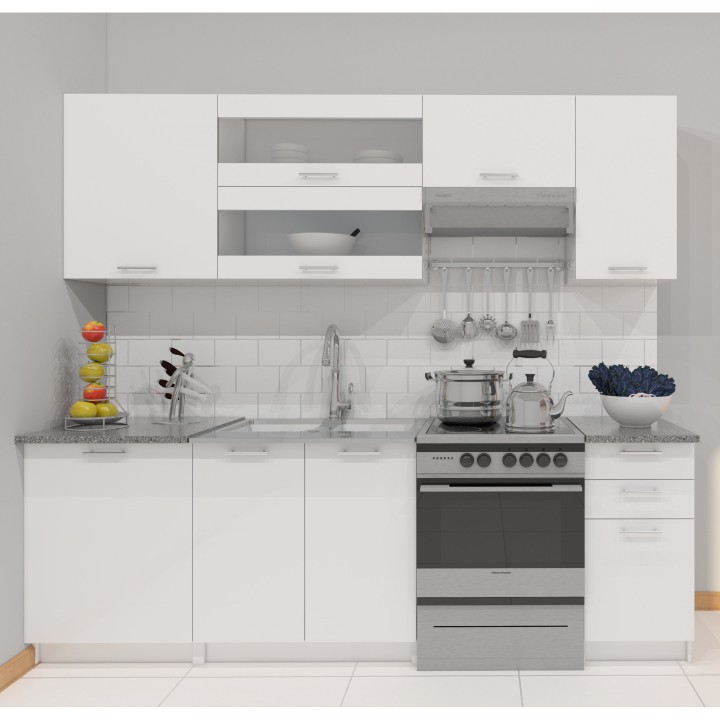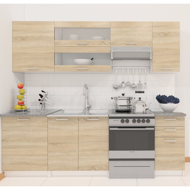 Setul complet de bucătărie este în versiunea color de arin, corpul este fabricat din PAL de lemn laminat cu structură internă mai groasă, cu uși create din MDF, iar sticla din dulapurile din partea superioară este clară. Lățimea părții superioare a dulapului de bucătărie și a hotei este de 2,4 m, iar lățimea părții inferioare a dulapului este de 1,8 m. Masca de chiuvetă este livrată fără blatul de lucru, astfel vă recomandăm să cumpărați o chiuvetă universală în magazinul nostru. Bucătăria este livrată fără aparate. Mânerele sunt de tip decorativ și sunt de culoare maronie.