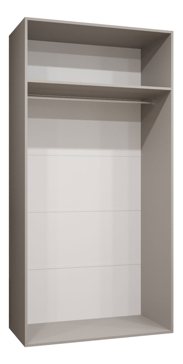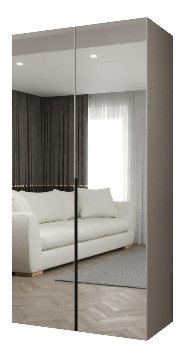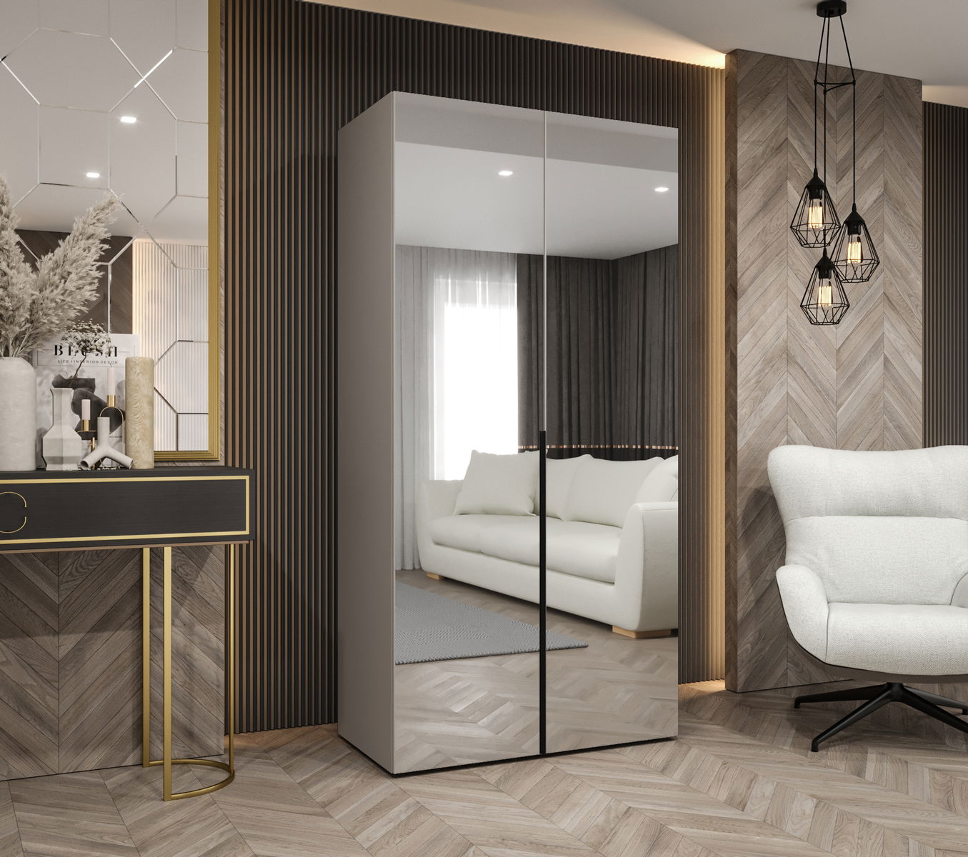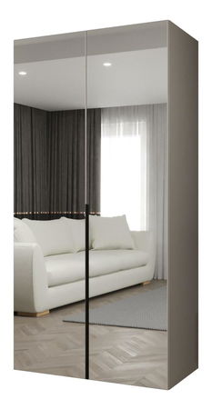 Dulapul de haine Alice 3, cu lățimea de 100 cm, este o opțiune practică pentru un dormitor sau dressing modern, combinând funcționalitatea cu un design rafinat. Finisajul în nuanțe de cașmir și negru, împreună cu ușile cu oglinzi integrale, deschid vizual spațiul și adaugă lumină, sporind senzația de încăpere aerisită și primitoare.