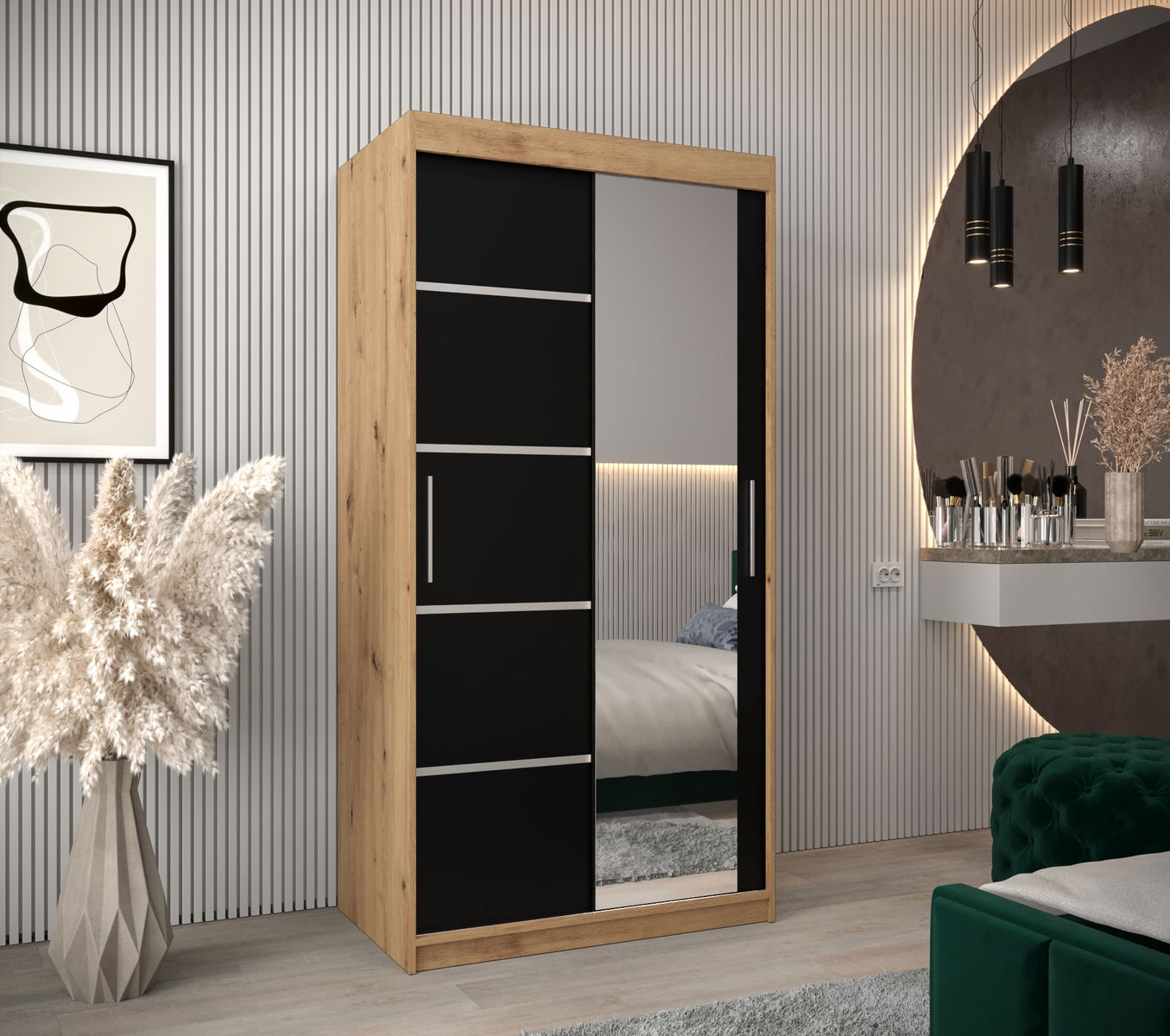 Dulap de haine 100 cm cu oglindă Verika 2 100 (stejar artisan + negru)