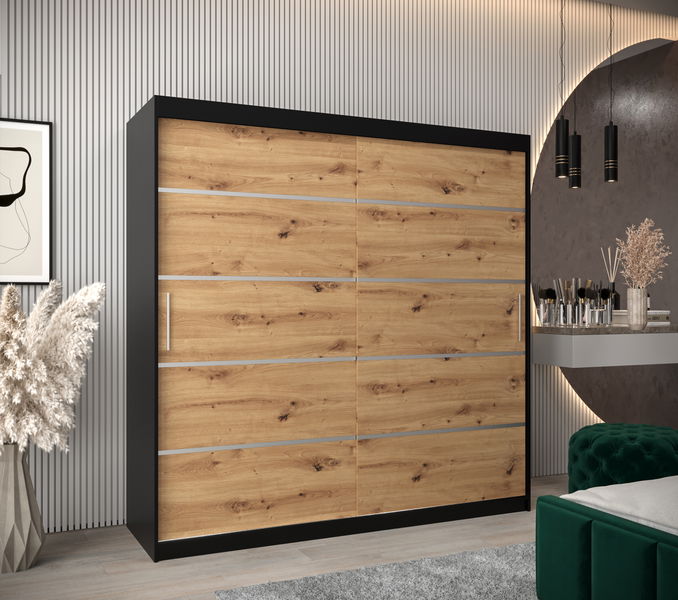 Designul distinct impresionează prin fronturile din stejar artisan naturale și structura robustă de culoare neagră, care se integrează armonios în interiorul contemporan sau industrial. Ușile glisante cu profile metalice subliniază stilul minimalist și facilitează accesul rapid la conținut, economisind spațiu în cameră.