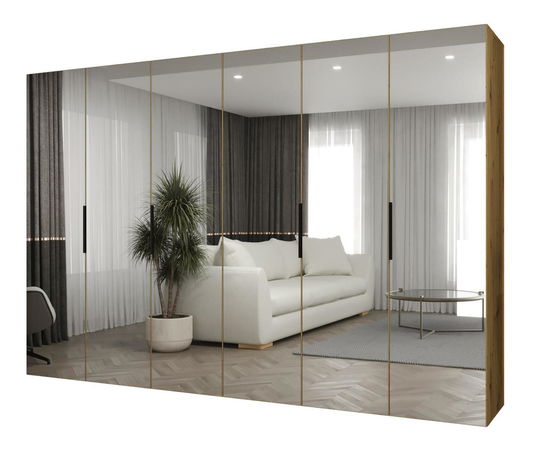Dulapul Mirabella 3 are o lățime generoasă de 300 cm și transformă orice dormitor într-un spațiu rafinat și practic. Realizat dintr-o combinație modernă de stejar artisan și negru, ușile cu oglinzi adaugă profunzime și lumină încăperii, sporind senzația de spațiu.