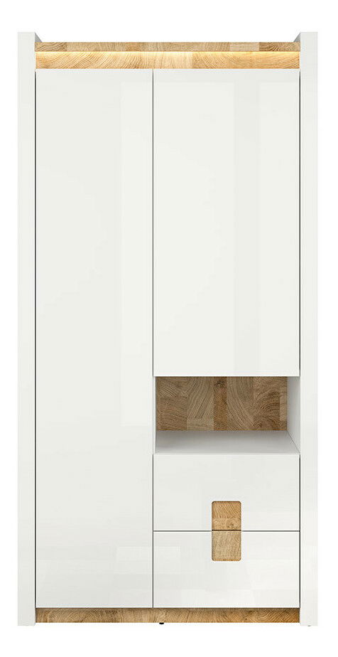 Dulap de haine elegant și modern care combină designul modern cu elemente naturale decorative discrete. Dulapul este împărțit în două părți și conține bară pentru umerașe pe partea stângă precum li rafturi cu spațiu deschis pe partea dreaptă. Ușile dulapului sunt cu închidere silențioasă.