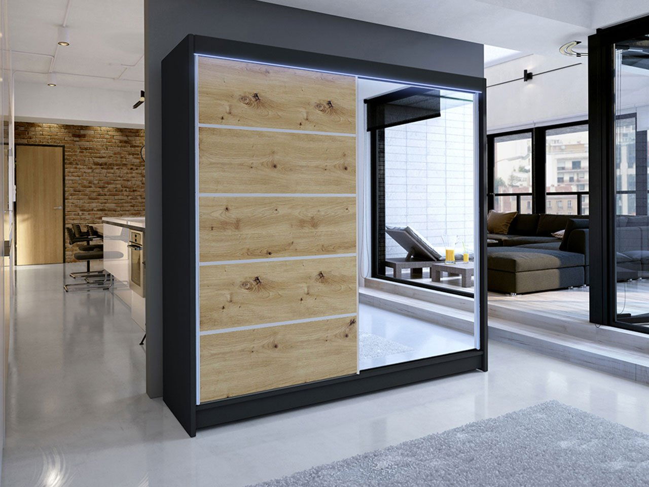 Dulap de haine Bastian III (Negru + stejar artisan) (iluminat LED rgb color)