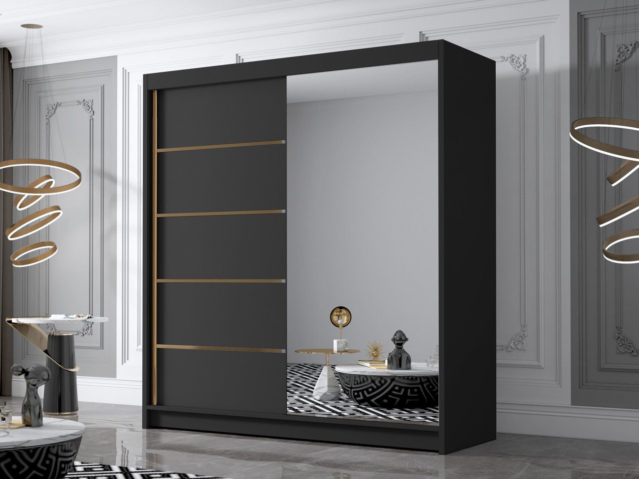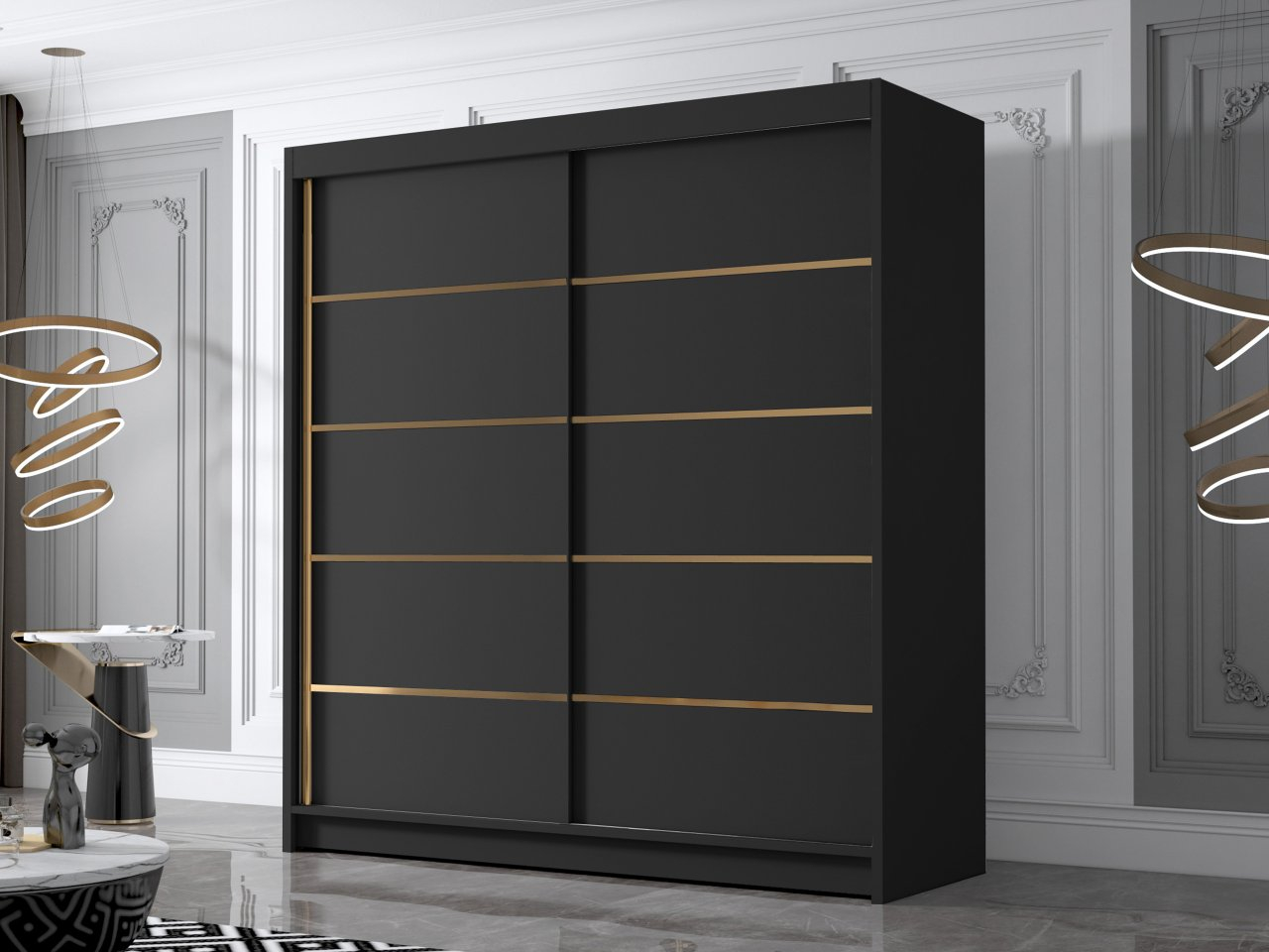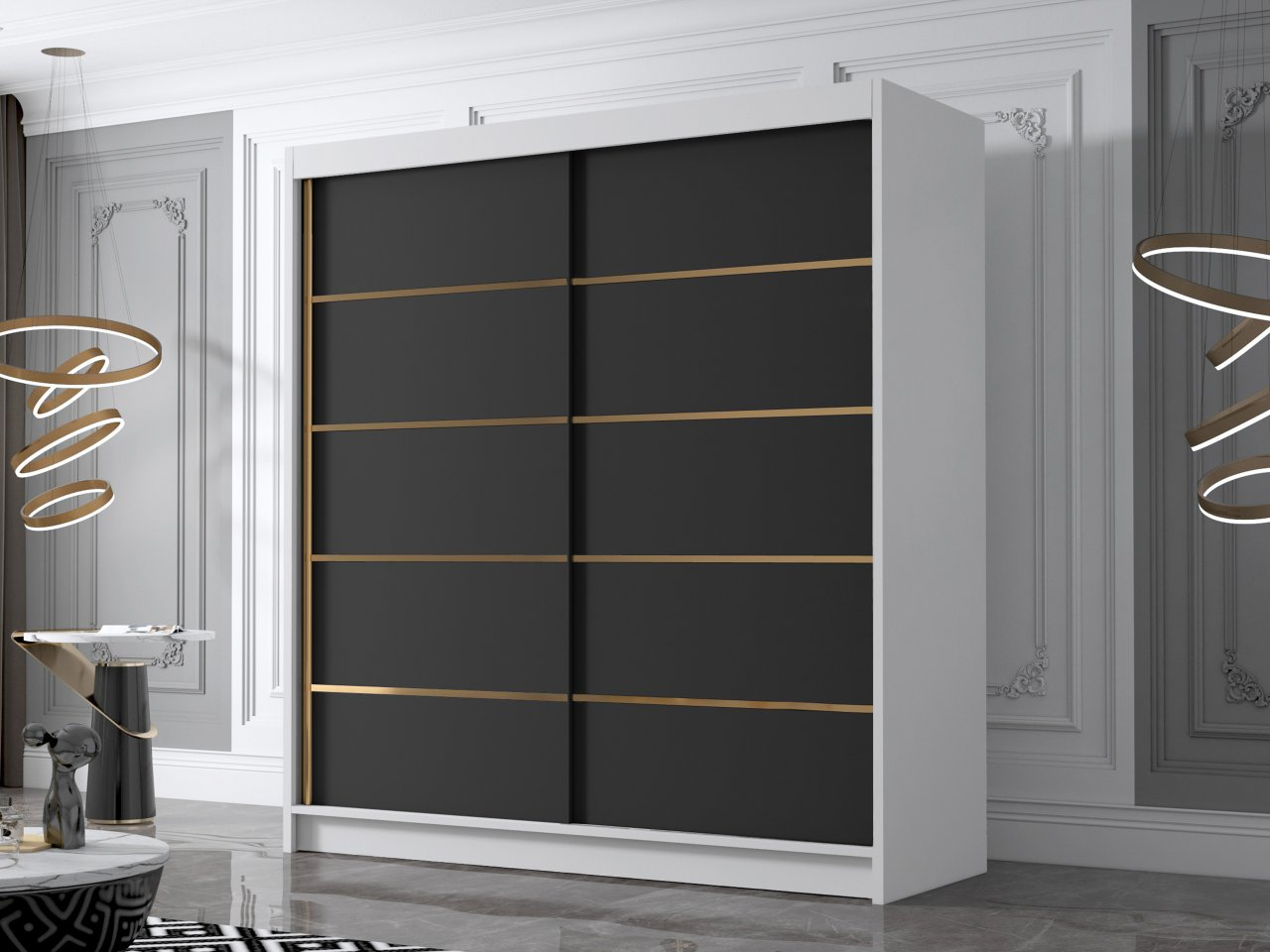 Dulap de haine cu uși culisante Bratoke III 180 (Alb + Negru + auriu) (cu oglindă)