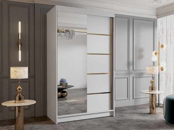 Monata III 100 este soluția ideală pentru organizație și stil în dormitorul tău modern. Cu un design alb mat și accente aurii rafinate, acest dulap cu uși culisante îmbină funcționalitatea cu estetica premium, fiind echipat cu o oglindă generoasă ce optimizează spațiul vizual al încăperii.
