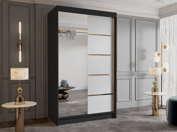 Dulap de haine cu uși culisante Monata III 100 (Negru + Alb + auriu) (cu oglindă)