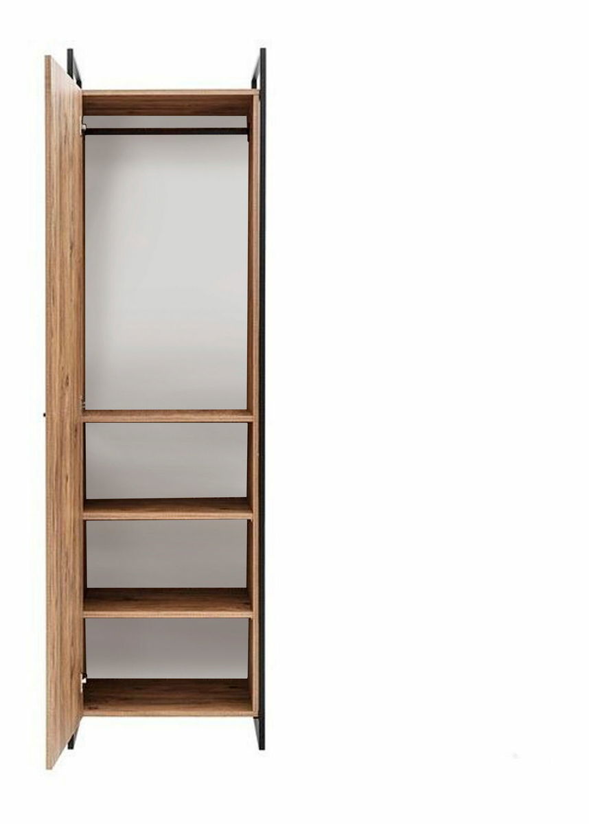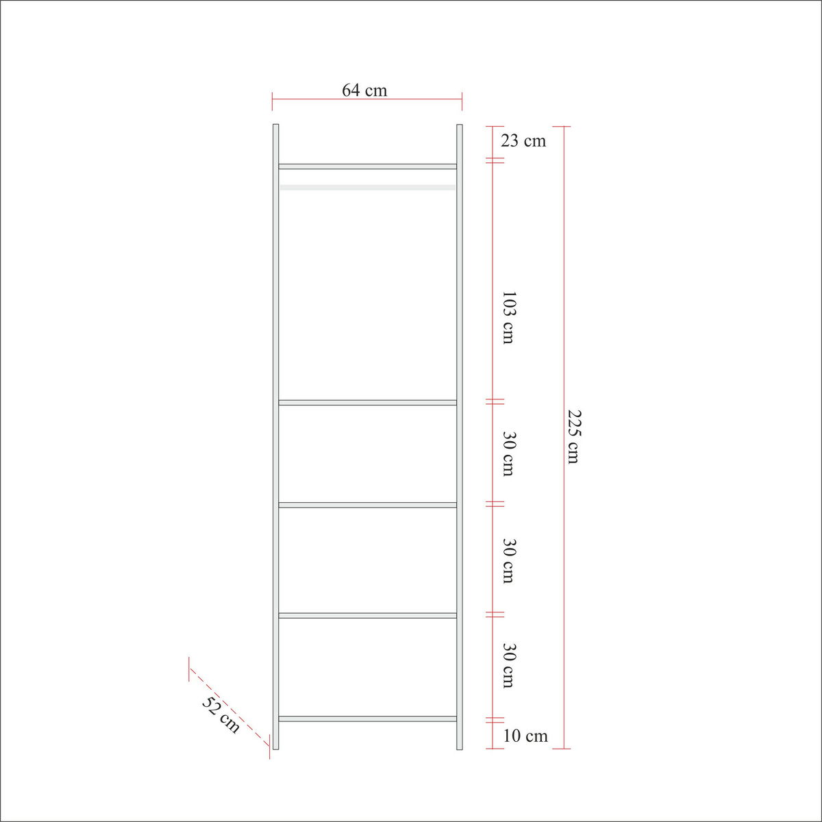 grosime: 18 mm, canturi PVC picioare metalice, dimensiuni dulap: lățime: 64 cm, înălțime: 225 cm, adâncime: 52 cm, înălțime raft superior: 103 cm, înălțime raft inferior: 30 cm, înălțime picioare: 10 cm