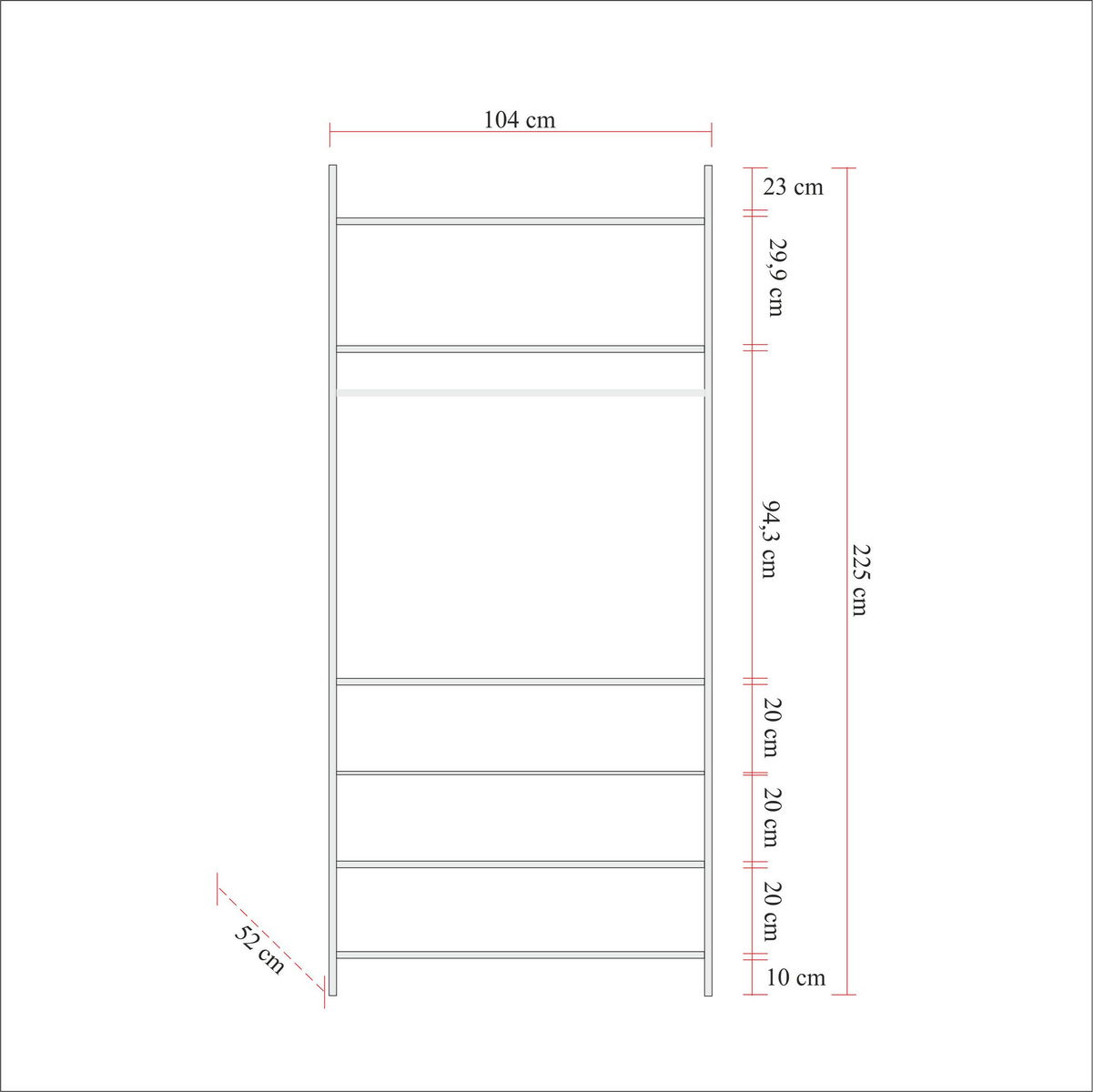 grosime: 18 mm, canturi PVC picioare metalice, dimensiuni dulap: lățime: 104 cm, înălțime: 225 cm, adâncime: 52 cm, înălțime raft superior: 29,9 cm, înălțime raft inferior: 20 cm, înălțime sertare: 20 cm, înălțime picioare: 10 cm