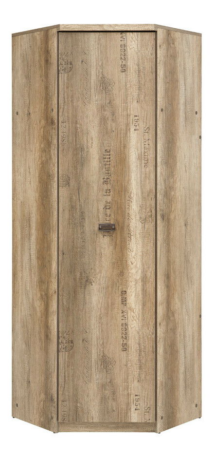 Dulap de haine, de colț, cu o ușă, include o tijă pentru agățat haine şi o zonă de rafturi. Dulapul are culori combinate modern, stejar canyon monument + wolfram gri, în combinație cu culorile stejar canyon monument cu imprimare 3D + wolfram gri, pe ușile noptierei și tăblia sertarelor. Acestea creează cele mai moderne trenduri din ziua de astăzi.