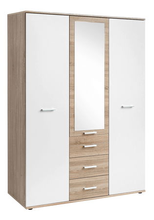 Dulap de haine spațios Emilio cu trei uși , cu un design modern, potrivit pentru camere copii și camere de tineret. Are uși pe lateral iar în mijloc este situată o ușă cu o oglindă și trei sertare. Dulapul este într-o versiune color frumoasă de stejar sonoma în combinație cu alb.