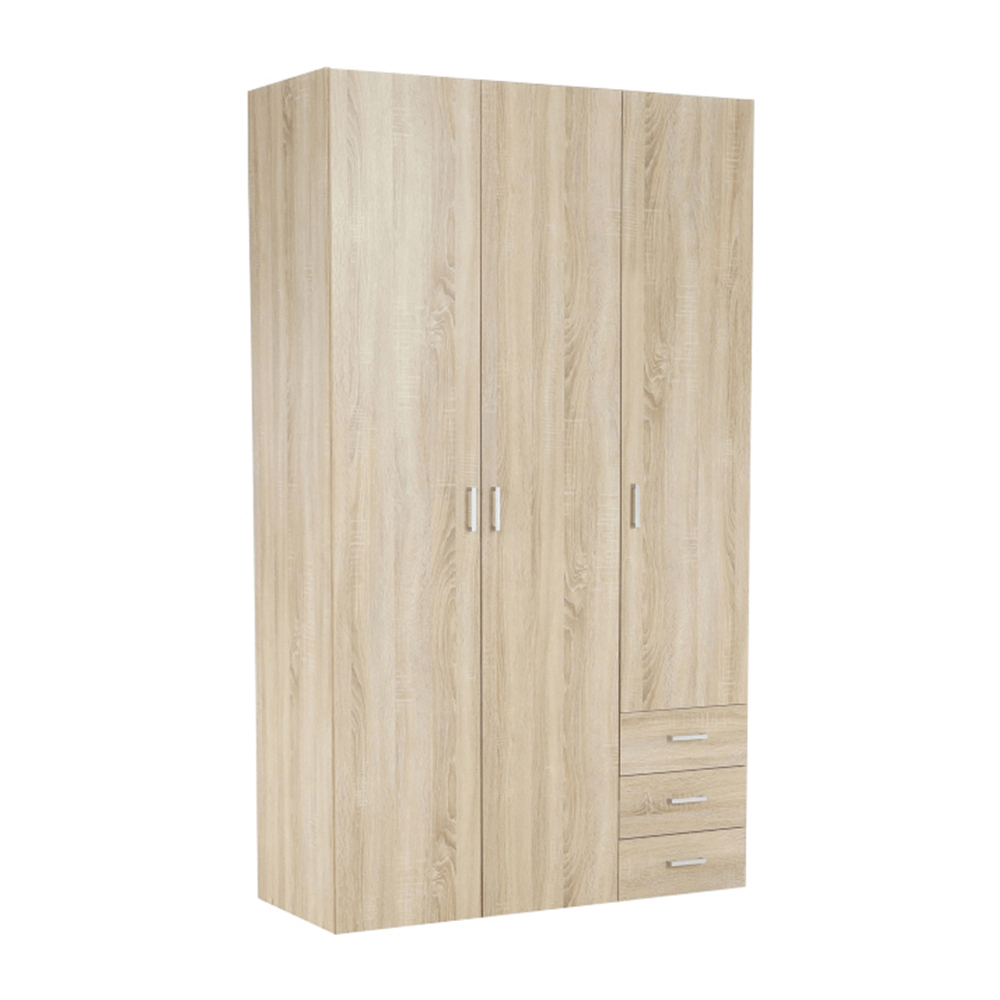Dulap pentru haine practic cu trei uși, combinat cu un raft și trei sertare este realizat din PAL de lemn cu material înfoliat cu structură internă mai groasă. Produsul este livrat demontat.