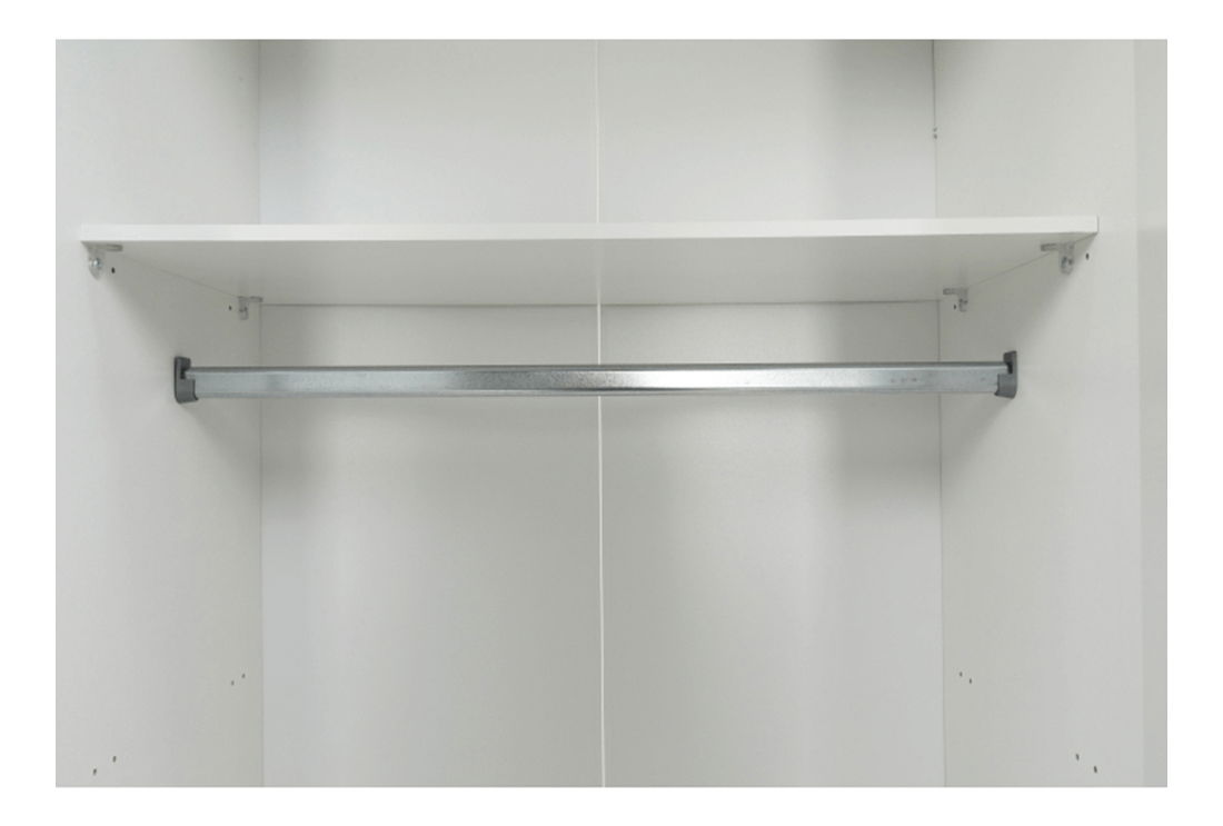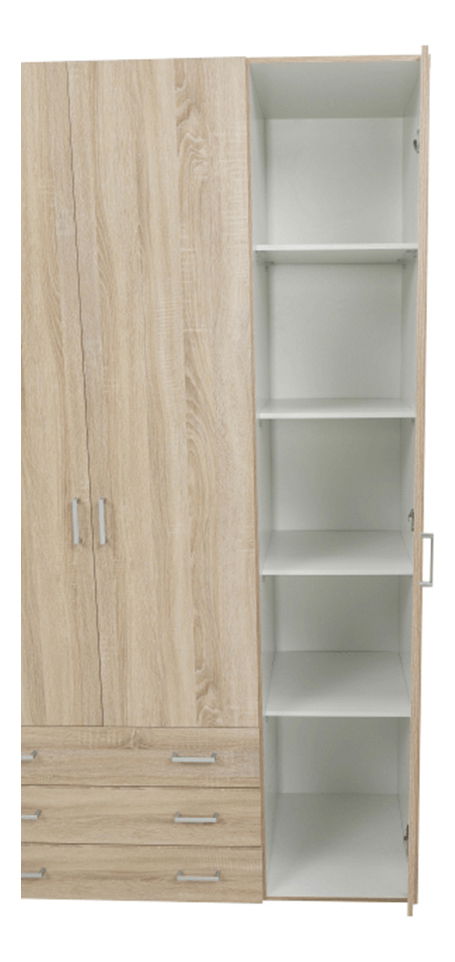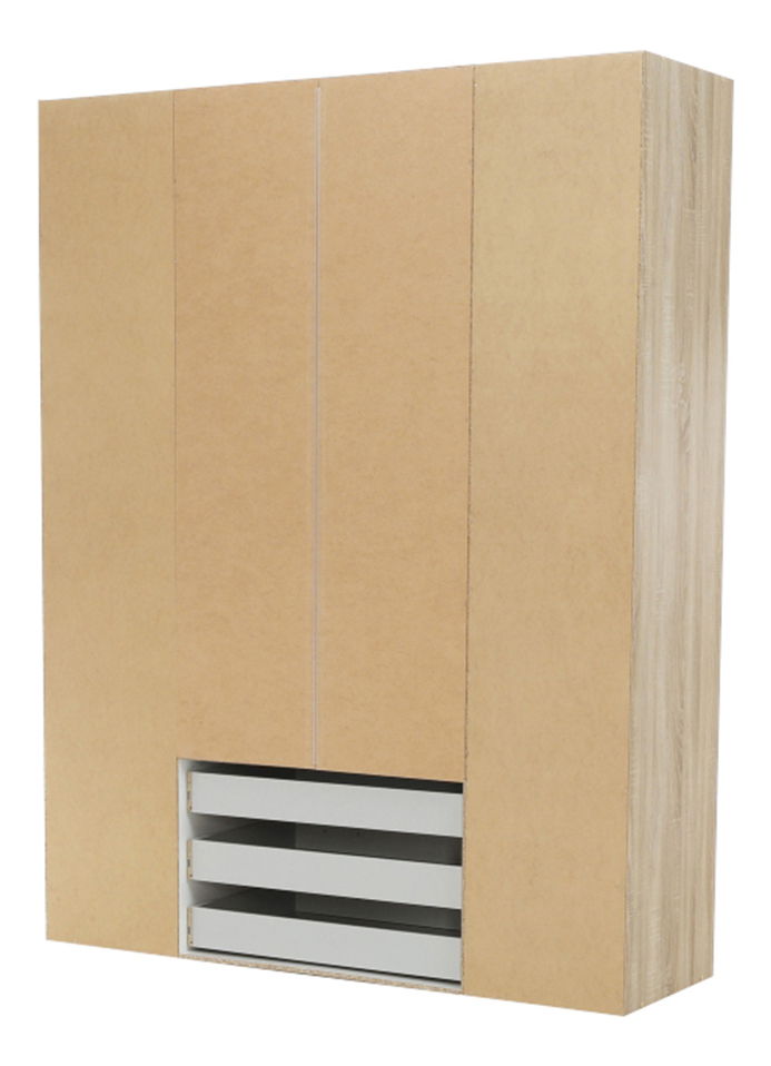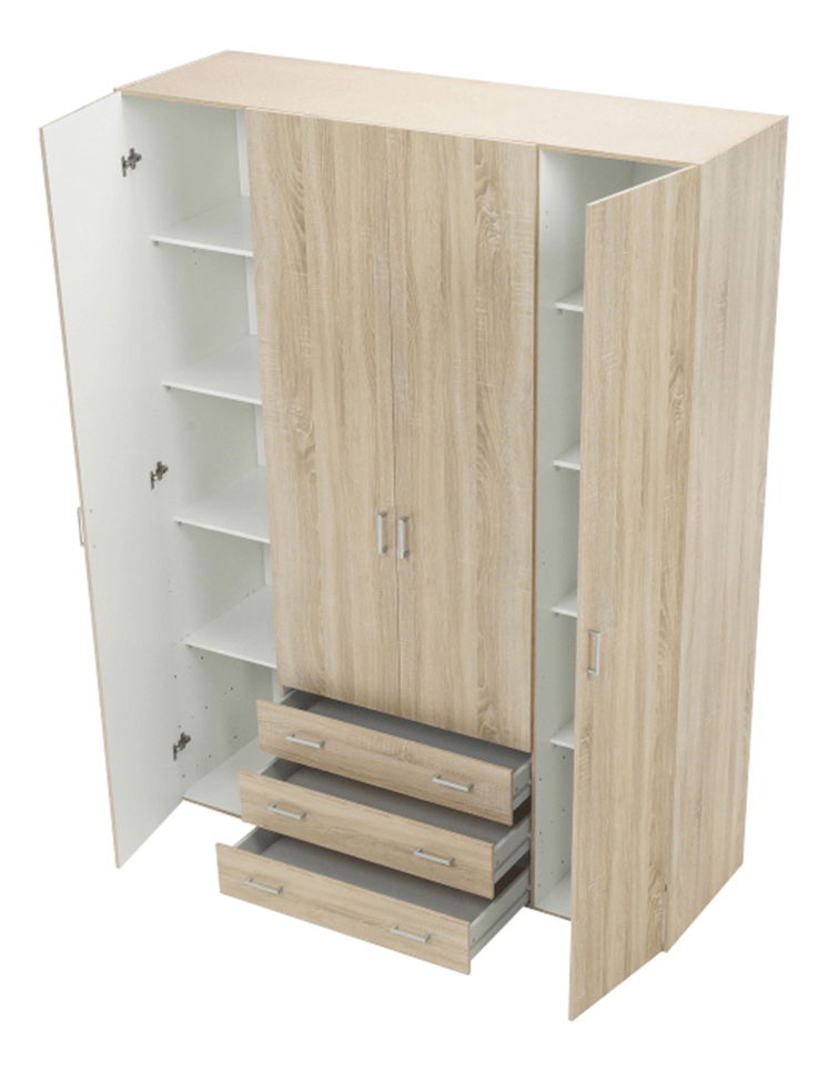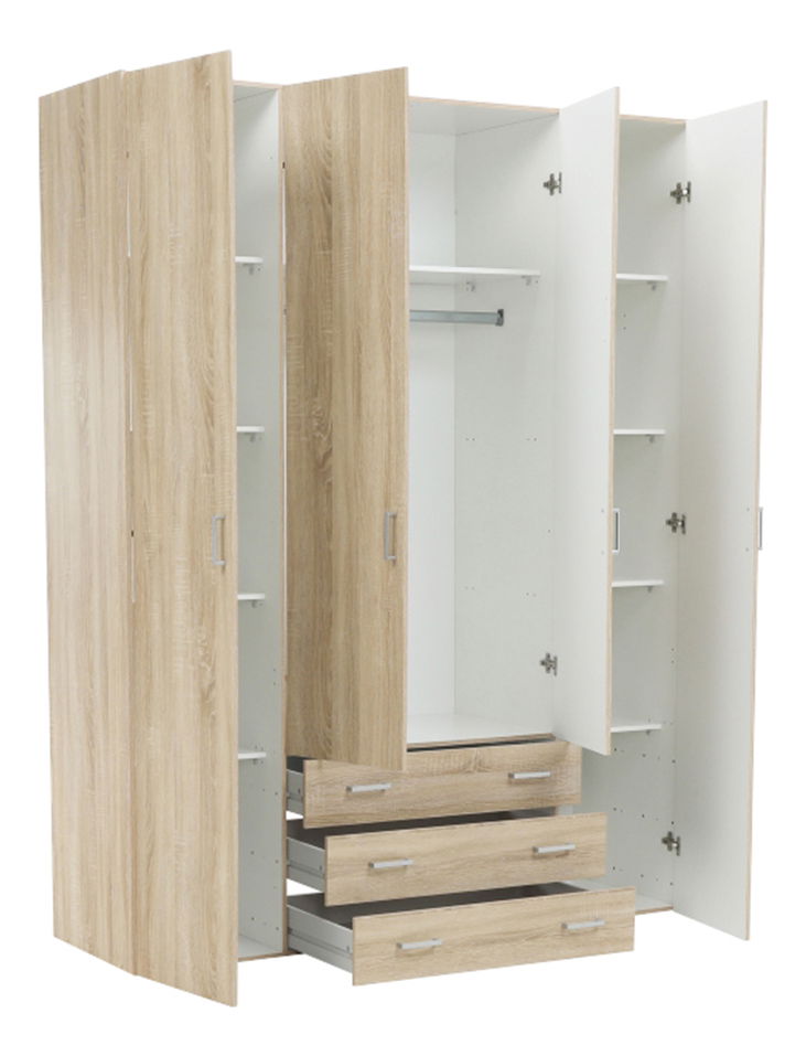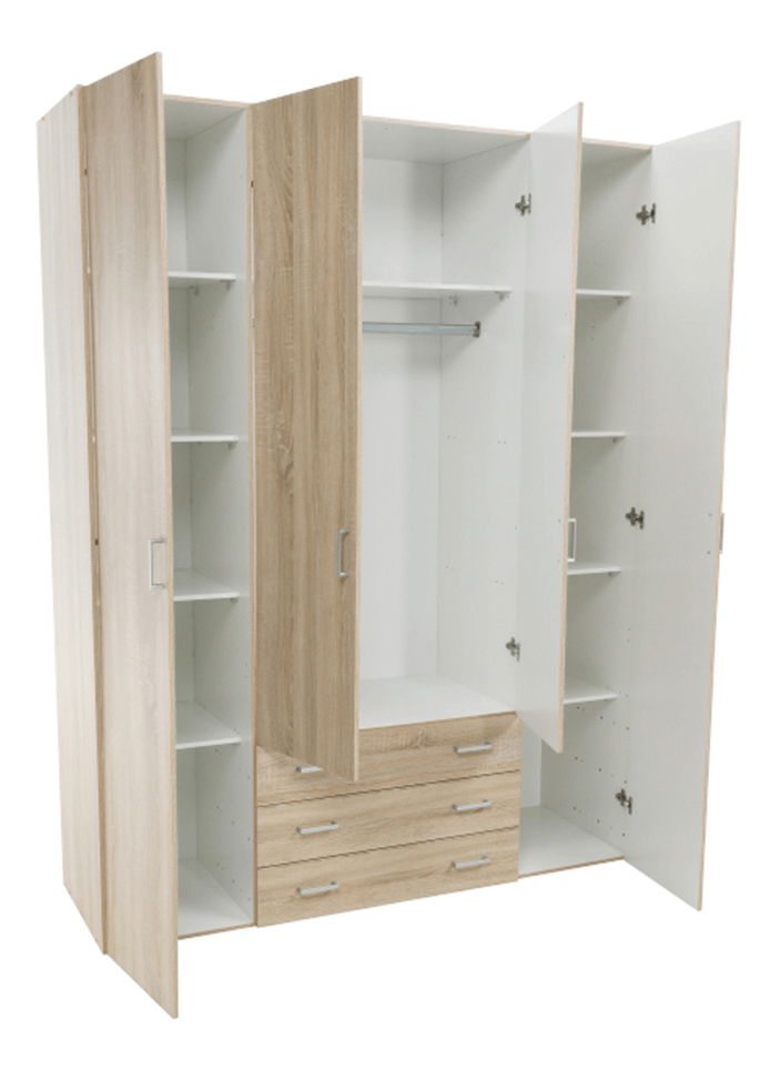 Dulap pentru haine practic cu patru uși, combinat cu un raft și trei sertare este realizat din PAL de lemn cu material foliat cu structură internă mai groasă. Produsul este livrat demontat.