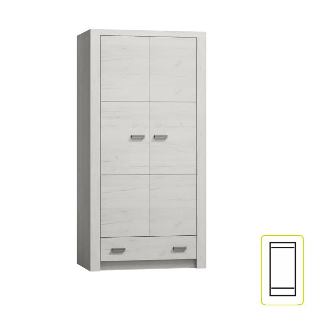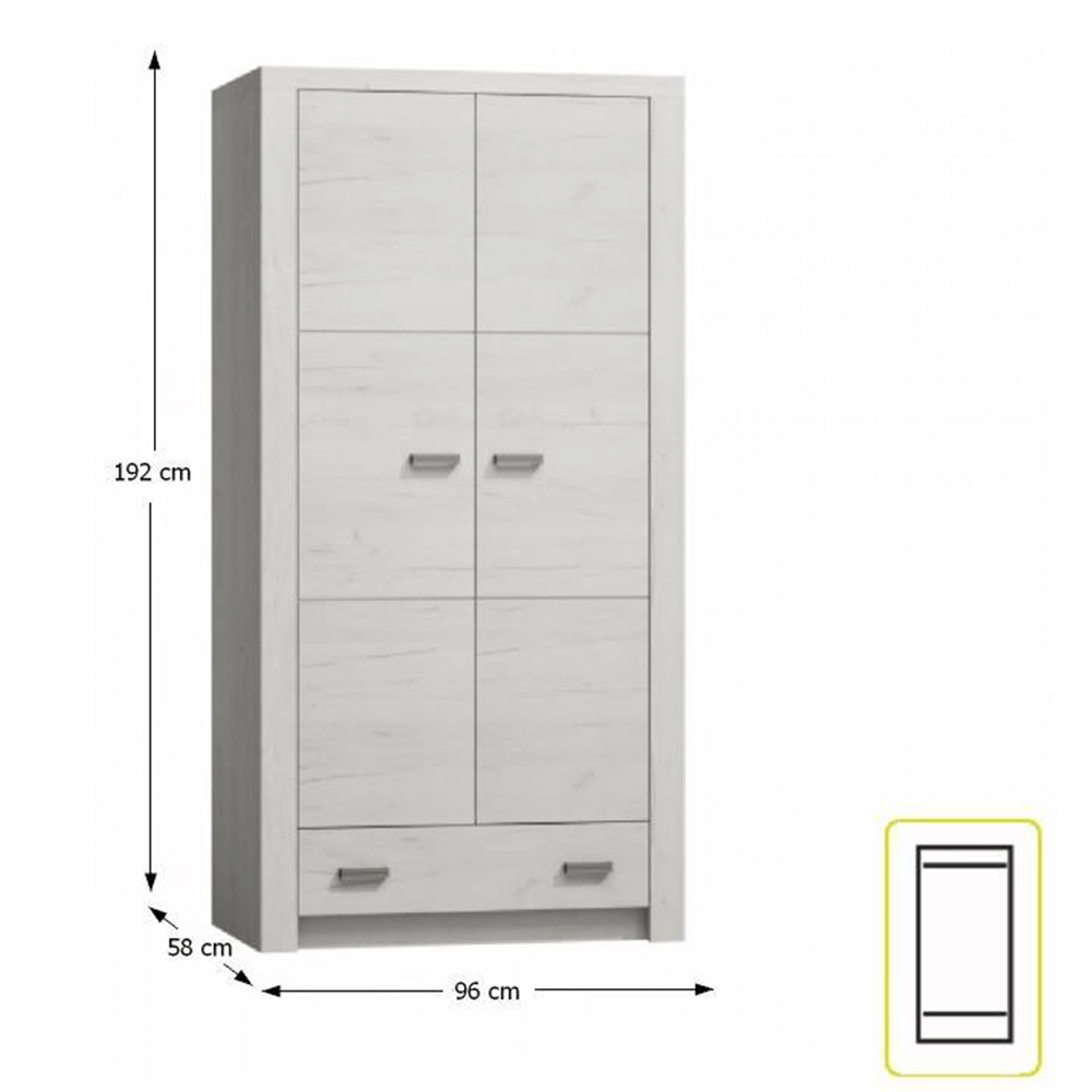 Dulap de haine care va fi un accesoriu practic în camera de zi, dormitor sau sufragerie. Conține bară pentru umerașe și un raft deasupra acesteia. În partea inferioară se află un sertar. Se livrează dezasamblat.