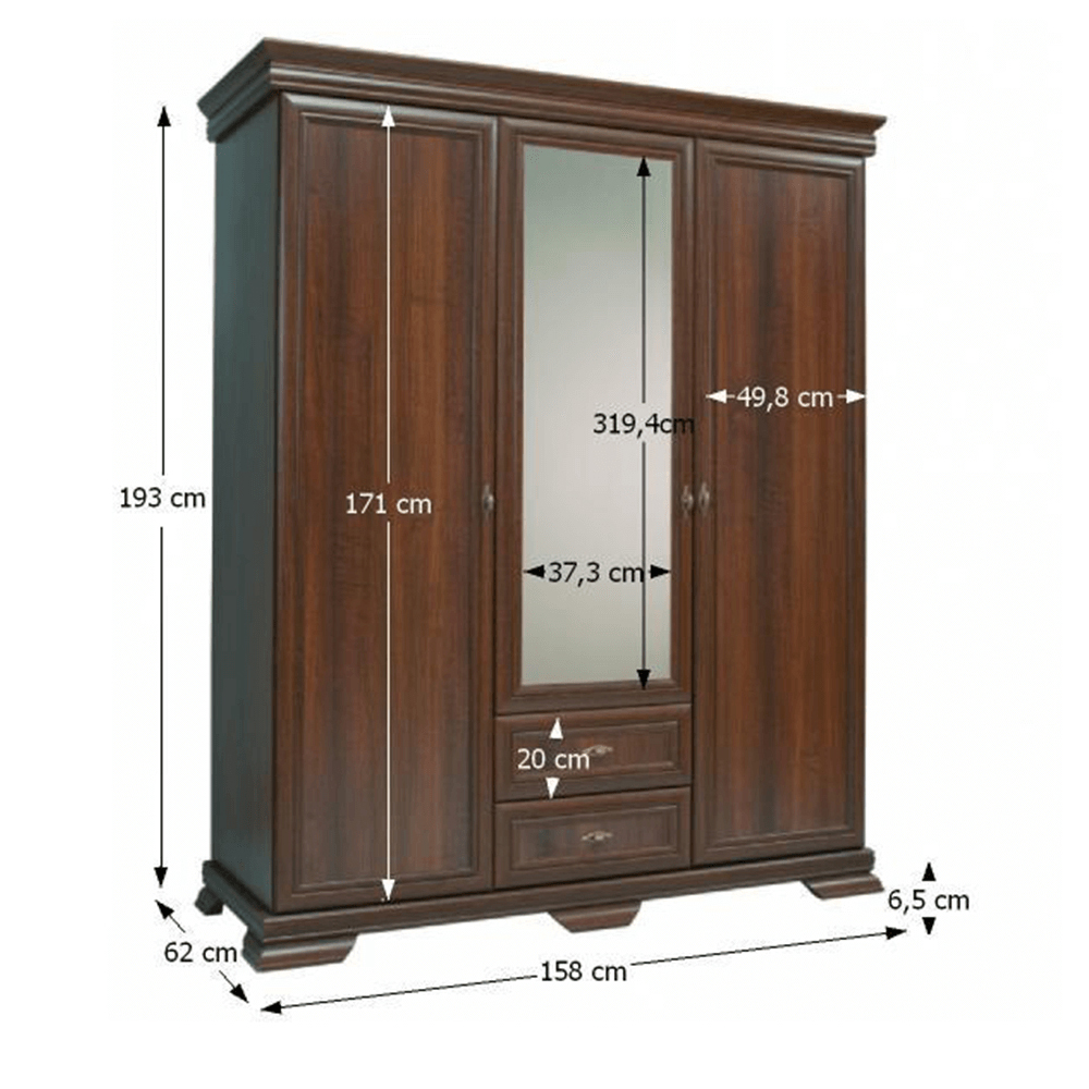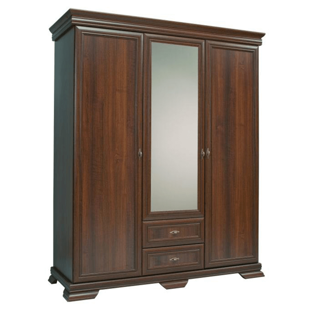 Dulap de haine spațios Kraz cu rafturi în stil rustic. Există uși pe margini, în partea de mijloc există o ușă cu oglindă și două sertare. Dulapul are picioare decorative, sculpturi și mânere metalice pe ușile și sertarele. Acesta va fi o bijuterie elegantă și unică în dormitorul dvs. Îl livrăm în culoarea elegantă King Samoa.
