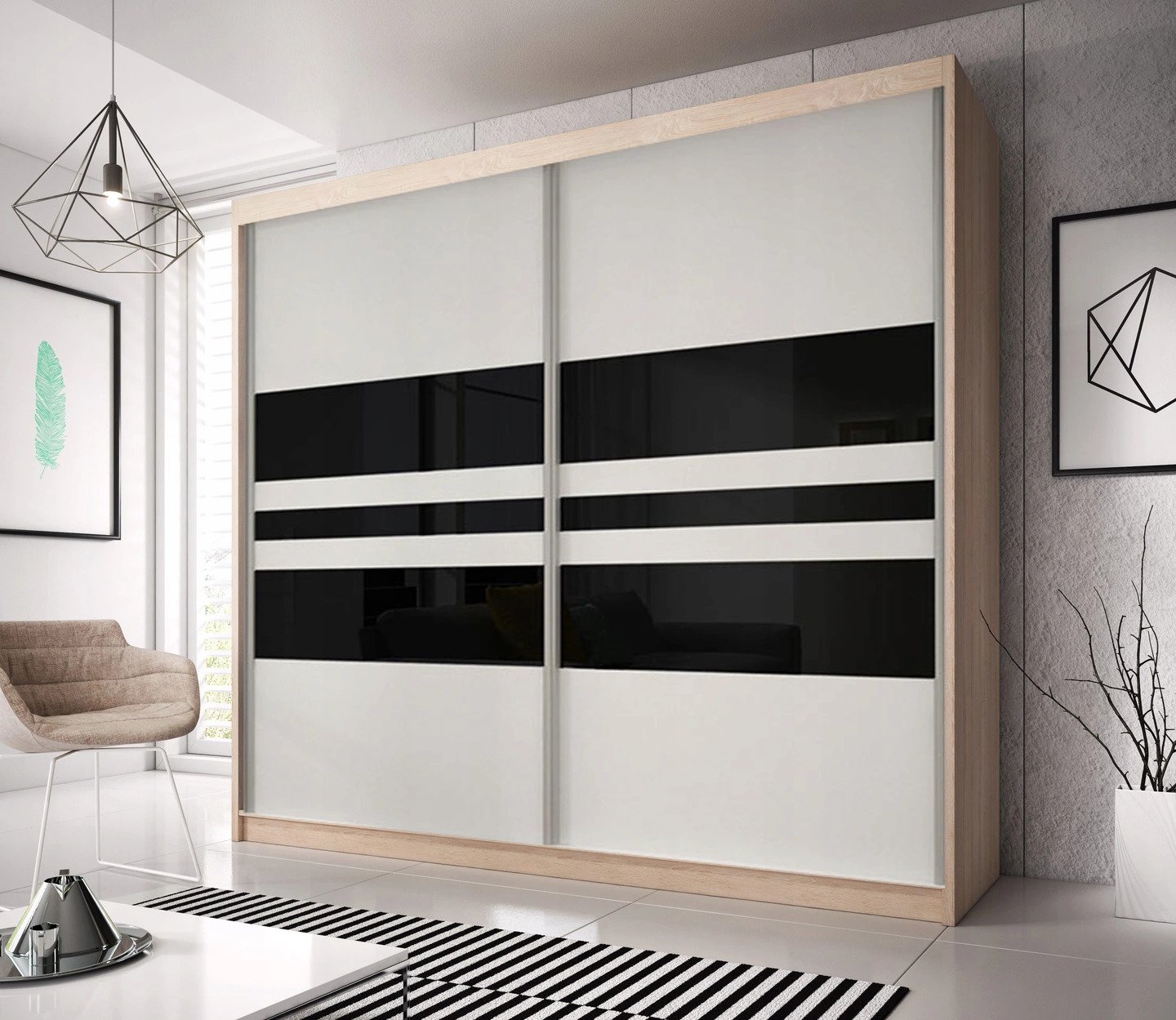 - Dulap de haine Mebur 01 230 (stejar sonoma + alb + sticlă neagră)
