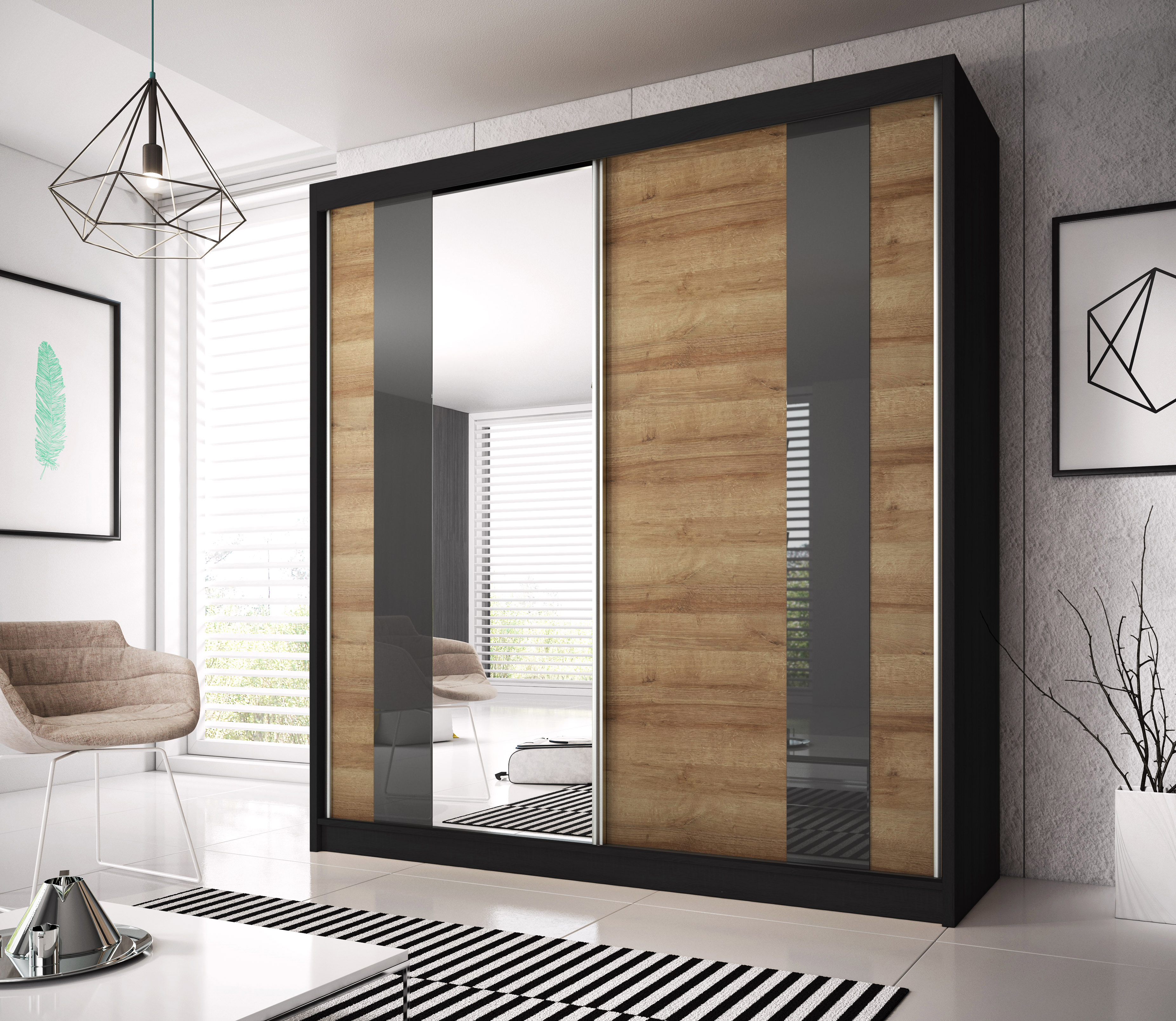 Dulap de haine Mebur 39 200 (negru + stejar riviera auriu + sticlă grafit + Oglindă)