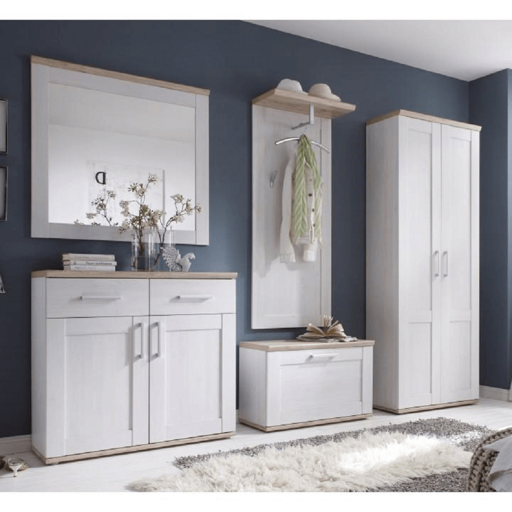 Dulap cu rafturi ideal pentru hol. Fabricat din PAL, în finisajul de Stejar San Remo în combinație cu culoare albă. Înăuntru sunt cinci rafturi.