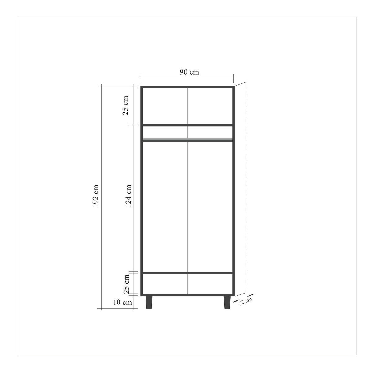 grosime: 18 mm, picioare crap, mânere metalice, strat UV, lățime: 90 cm, înălțime: 192 cm, adâncime: 52 cm, înălțime raft superior: 25 cm, înălțime raft inferior: 25 cm, înălțime picioare: 10 cm