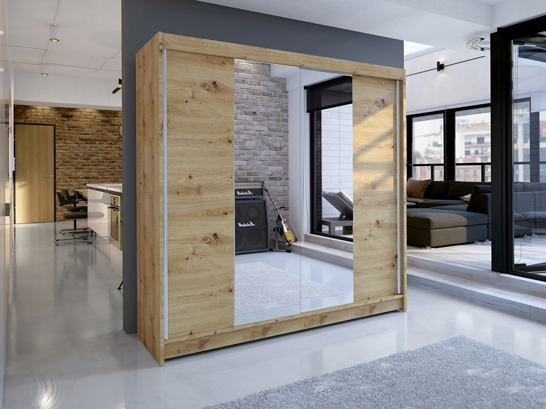 Dulapul Tatiana cu dimensiunile de 215 x 180 x 58 cm oferă suficient spațiu de depozitare pentru fiecare. Ușile dulapului sunt acoperite cu panouri de oglindă (cu exceptia unui dulap din această gamă) și PAL cu tratament de suprafață. br> Interiorul dulapului este format din rafturi și bare pentru umerașe. Dulapul are o combinație de culori atractive și o soluție de design interesantă. Aceste soluții vor permite să creați o atmosferă calmă și armonioasă în cameră.