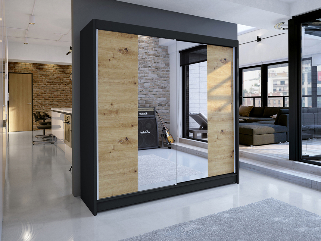 Dulapul Tatiana cu dimensiunile de 215 x 180 x 58 cm oferă suficient spațiu de depozitare pentru fiecare. Ușile dulapului sunt acoperite cu panouri de oglindă (cu exceptia unui dulap din această gamă) și PAL cu tratament de suprafață. br> Interiorul dulapului este format din rafturi și bare pentru umerașe. Dulapul are o combinație de culori atractive și o soluție de design interesantă. Aceste soluții vor permite să creați o atmosferă calmă și armonioasă în cameră.