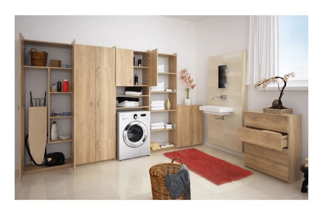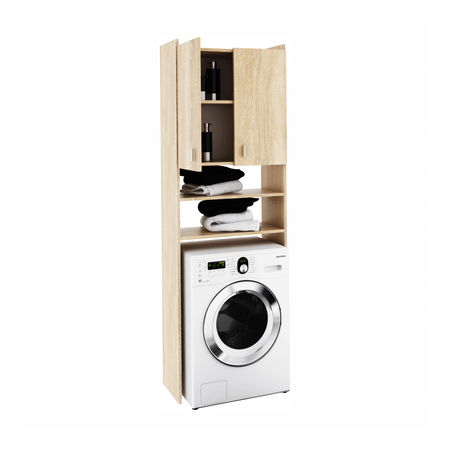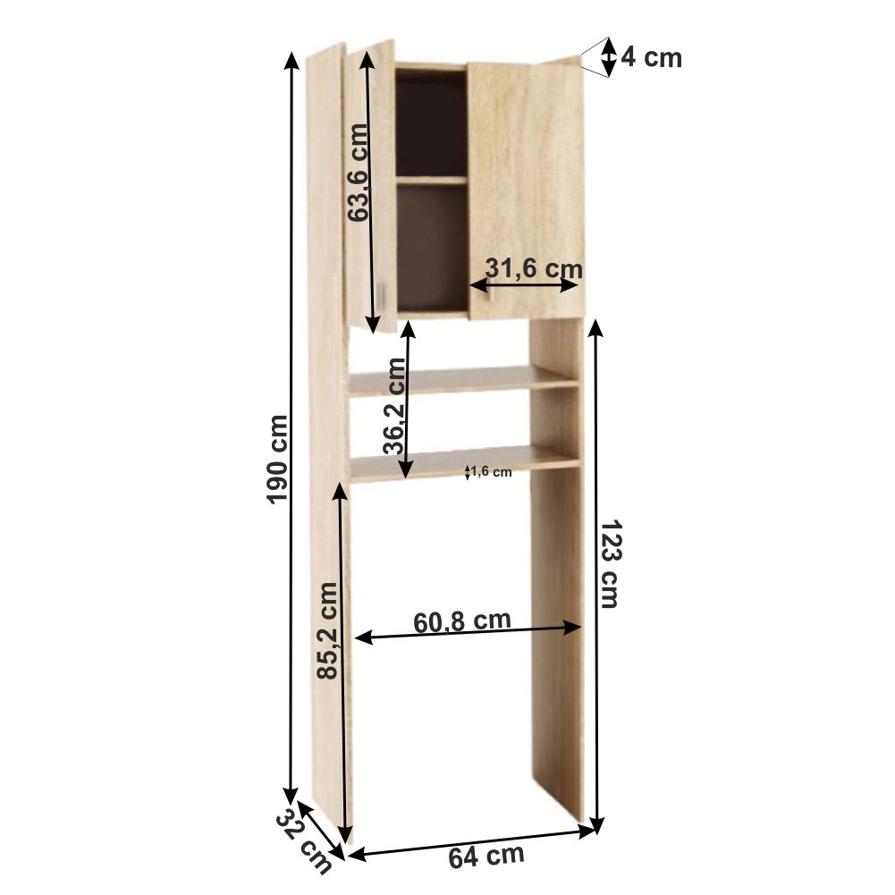 Datorită acestui dulap practic pentru mașina de spălat veți economisi spațiu în baia dvs. Se potrivește de asemenea în încăperi mici. Dulapul are în partea superioară o ușă cu două compartimente de depozitare. Sub ușă sunt plasate două polițe. Se potrivește pentru mașini de spălat cu lățime maximă de 60 x 85 cm.