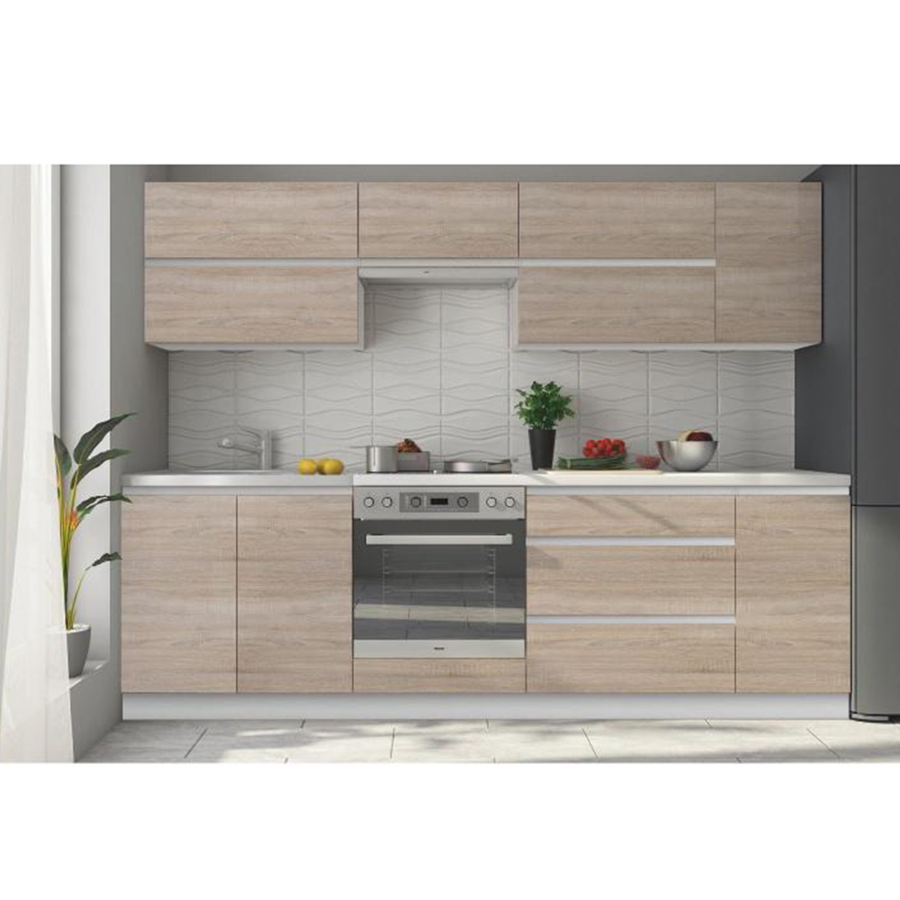 Setul stilat de bucătărie Lilouse creează din bucătăria dvs. un spațiu modern, în care veți găti cu bucurie. Setul de bucătărie este fabricat din pal de lemn laminat de calitate. Blatul de lucru are o grosime de 38 de mm. Dulapurile individuale au un sistem silențios de închidere a ușilor și o închidere silențioasă a sertarelor.