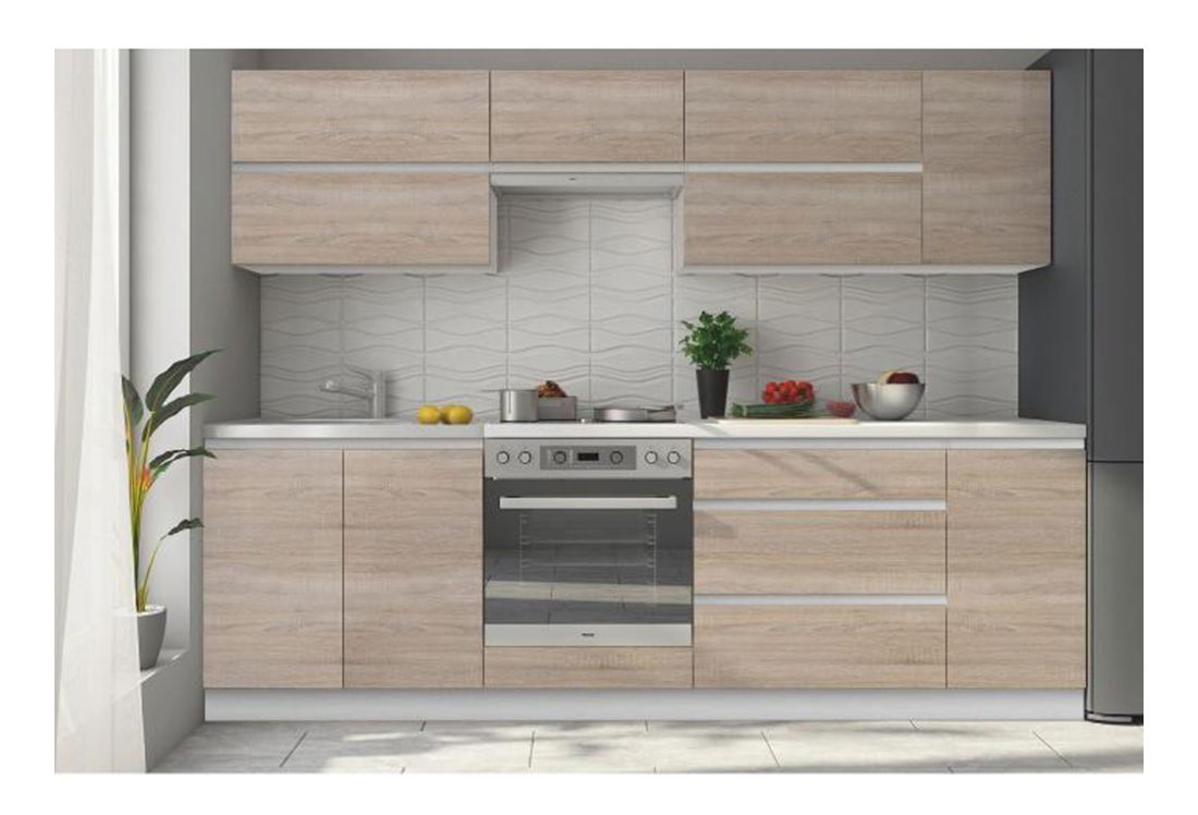 Setul stilat de bucătărie Lilouse creează din bucătăria dvs. un spațiu modern, în care veți găti cu bucurie. Setul de bucătărie este fabricat din pal de lemn laminat de calitate. Blatul de lucru are o grosime de 38 de mm. Dulapurile individuale au un sistem silențios de închidere a ușilor și o închidere silențioasă a sertarelor.