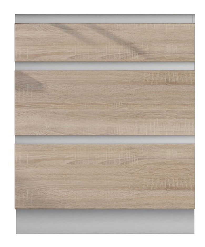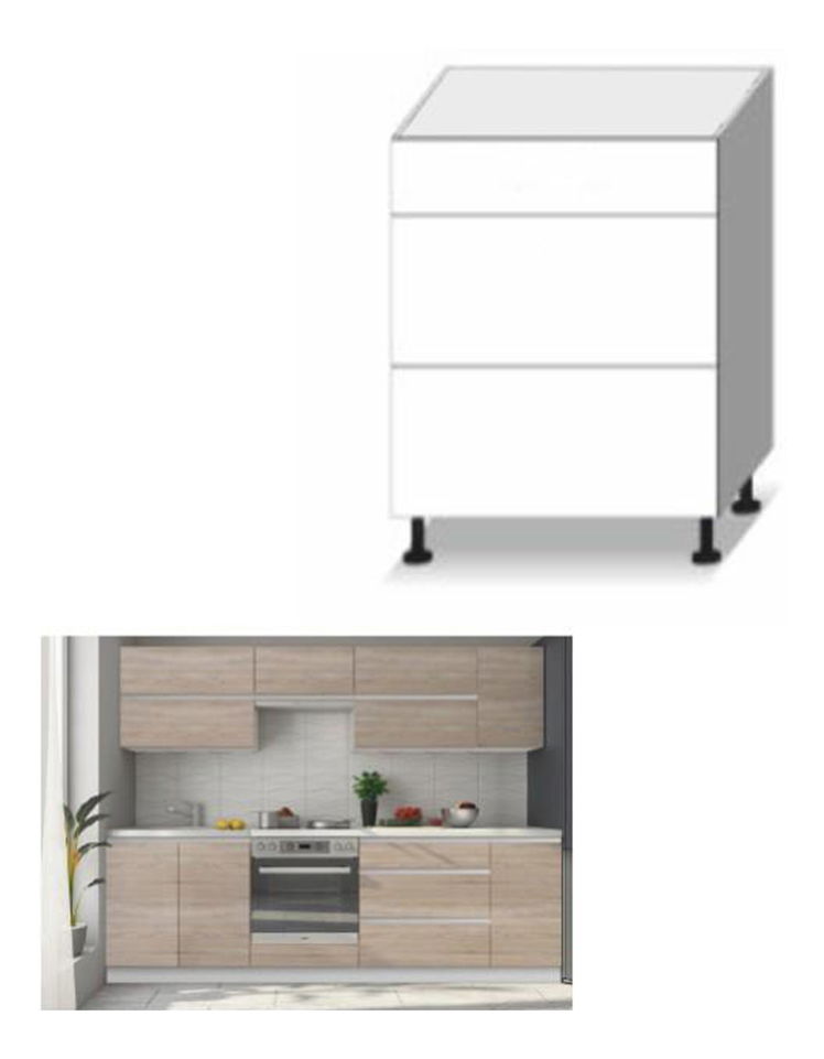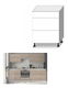 Corp inferior de bucătărie din seria Line. Dulapul are trei sertare cu un sistem silențios de oprire. Este livrat împreună cu blatul de lucru și cu o bară inferioară.