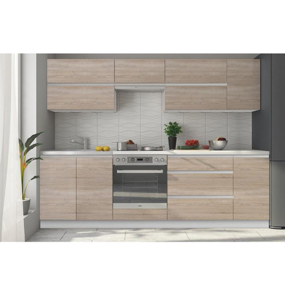 Setul stilat de bucătărie Lilouse creează din bucătăria dvs. un spațiu modern, în care veți găti cu bucurie. Setul de bucătărie este fabricat din pal de lemn laminat de calitate. Blatul de lucru are o grosime de 38 de mm. Dulapurile individuale au un sistem silențios de închidere a ușilor și o închidere silențioasă a sertarelor.