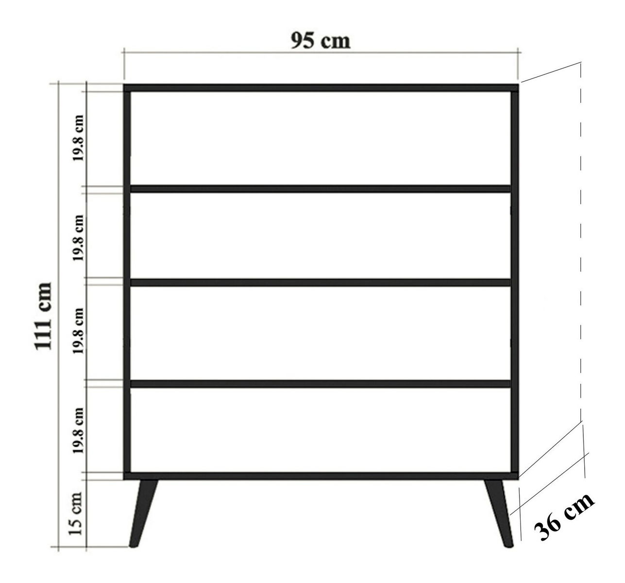 grosime: 18 mm, picioare crap, mânere metalice, strat UV, lățime: 95 cm, înălțime: 111 cm, adâncime: 36 cm, înălțime raft: 19,8 cm, înălțime picioare: 15 cm